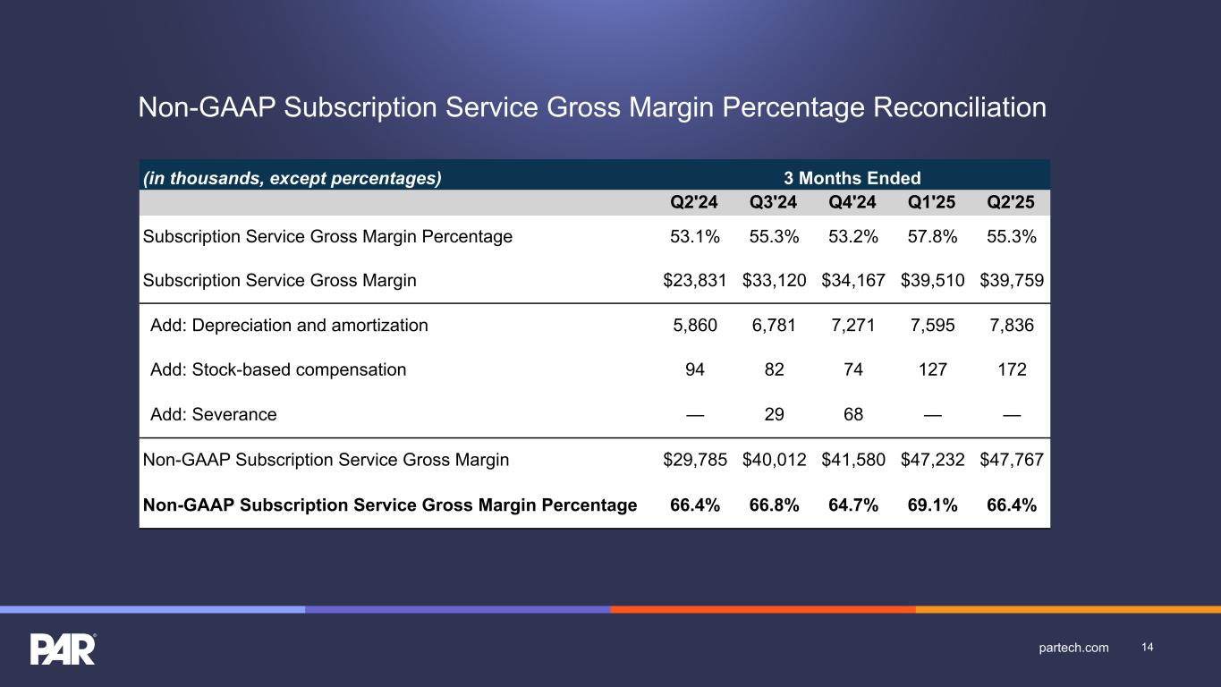 Non-GAAP Subscription Service Gross Margin Percentage Reconciliation (in thousands, except percentages) 3 Months Ended Q2'24 Q3'24 Q4'24 Q1'25 Q2'25 Subscription Service Gross Margin Percentage 53.1% 55.3% 53.2% 57.8% 55.3% Subscription Service Gross Margin $23,831 $33,120 $34,167 $39,510 $39,759 Add: Depreciation and amortization 5,860 6,781 7,271 7,595 7,836 Add: Stock-based compensation 94 82 74 127 172 Add: Severance — 29 68 — — Non-GAAP Subscription Service Gross Margin $29,785 $40,012 $41,580 $47,232 $47,767 Non-GAAP Subscription Service Gross Margin Percentage 66.4% 66.8% 64.7% 69.1% 66.4% 14partech.com