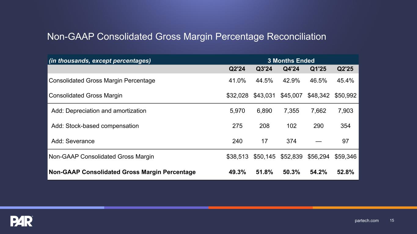 Non-GAAP Consolidated Gross Margin Percentage Reconciliation (in thousands, except percentages) 3 Months Ended Q2'24 Q3'24 Q4'24 Q1'25 Q2'25 Consolidated Gross Margin Percentage 41.0% 44.5% 42.9% 46.5% 45.4% Consolidated Gross Margin $32,028 $43,031 $45,007 $48,342 $50,992 Add: Depreciation and amortization 5,970 6,890 7,355 7,662 7,903 Add: Stock-based compensation 275 208 102 290 354 Add: Severance 240 17 374 — 97 Non-GAAP Consolidated Gross Margin $38,513 $50,145 $52,839 $56,294 $59,346 Non-GAAP Consolidated Gross Margin Percentage 49.3% 51.8% 50.3% 54.2% 52.8% 15partech.com