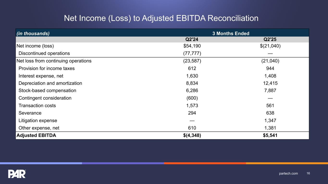 (in thousands) 3 Months Ended Q2'24 Q2'25 Net income (loss) $54,190 $(21,040) Discontinued operations (77,777) — Net loss from continuing operations (23,587) (21,040) Provision for income taxes 612 944 Interest expense, net 1,630 1,408 Depreciation and amortization 8,834 12,415 Stock-based compensation 6,286 7,887 Contingent consideration (600) — Transaction costs 1,573 561 Severance 294 638 Litigation expense — 1,347 Other expense, net 610 1,381 Adjusted EBITDA $(4,348) $5,541 Net Income (Loss) to Adjusted EBITDA Reconciliation 16partech.com