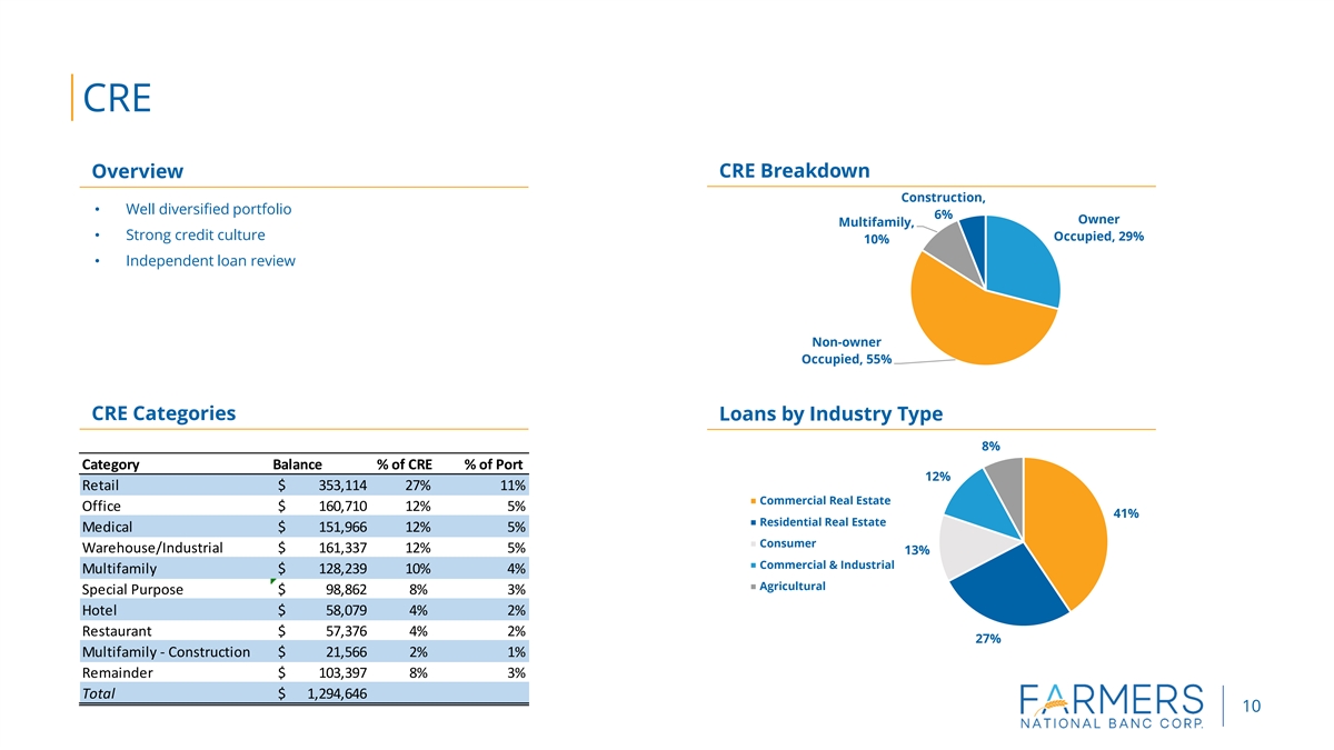 Loan Portfolio Overview Overview Rate Type Segments • Total loans $3.2 billion Variable, 14% • Diverse loan mix • Farmers’ practice is to lend primarily within its market area Fixed, 52% Adjustable, 34% Total Loans (in millions) Net Loans to Assets $3,500.00 73.4% 66.9% $3,000.00 63.0% 58.3% $2,500.00 55.6% $2,000.00 $1,500.00 $1,000.00 $500.00 $0.00 2019 2020 2021 2022 9/30/2023 2019 2020 2021 2022 9/30/2023 CRE C&I Agricultural Residential Mortgage Consumer 9