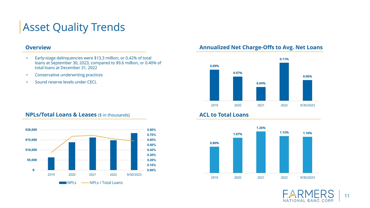 Asset Quality Trends Overview Annualized Net Charge-Offs to Avg. Net Loans • Early-stage delinquencies were $13.3 million, or 0.42% of total 0.11% loans at September 30, 2023, compared to $9.6 million, or 0.40% of 0.09% total loans at December 31, 2022 0.07% • Conservative underwriting practices 0.06% • Sound reserve levels under CECL 0.04% 2019 2020 2021 2022 9/30/2023 NPLs/Total Loans & Leases ($ in thousands) ACL to Total Loans 1.26% $20,000 0.80% 1.12% 1.10% 1.07% 0.70% $15,000 0.60% 0.80% 0.50% $10,000 0.40% 0.30% $5,000 0.20% 0.10% $- 0.00% 2019 2020 2021 2022 9/30/2023 2019 2020 2021 2022 9/30/2023 NPLs NPLs / Total Loans 11