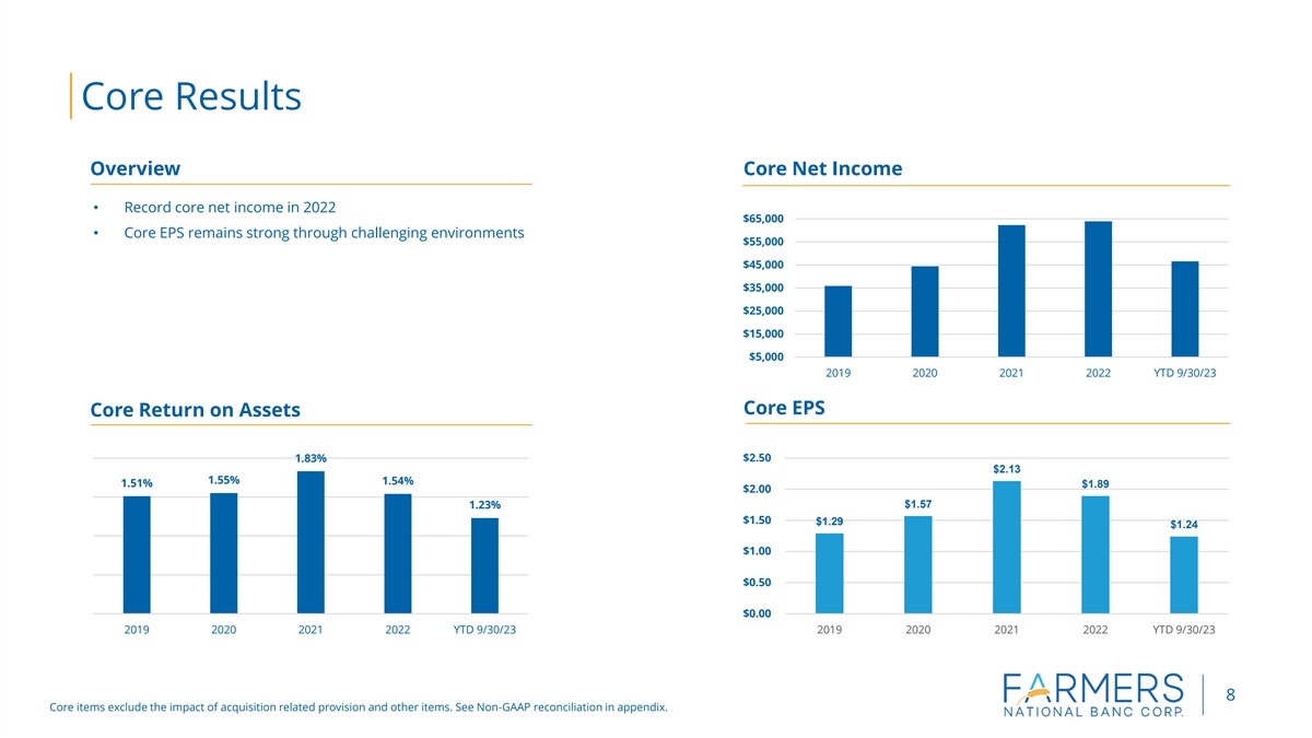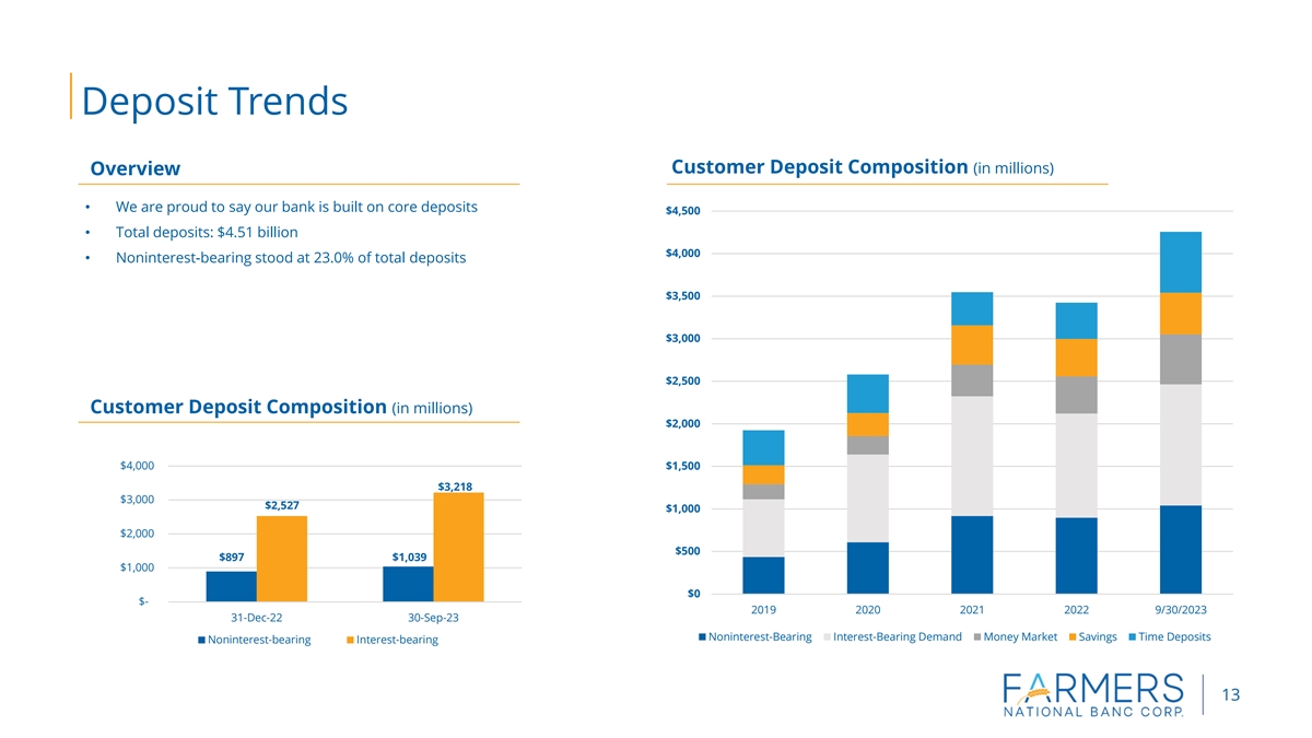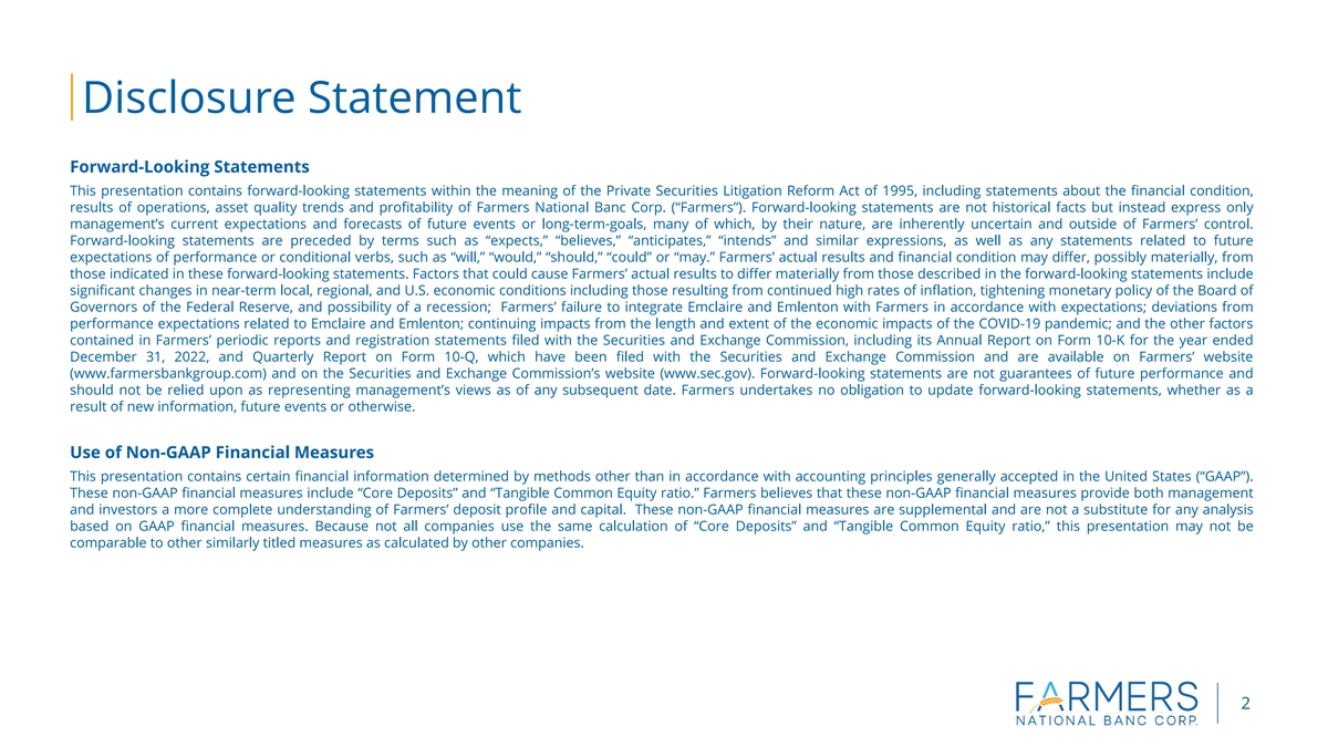Disclosure Statement Forward-Looking Statements​ This presentation contains forward-looking statements within the meaning of the Private Securities Litigation Reform Act of 1995, including statements about the financial condition, results of operations, asset quality trends and profitability of Farmers National Banc Corp. (“Farmers”). Forward-looking statements are not historical facts but instead express only management’s current expectations and forecasts of future events or long-term-goals, many of which, by their nature, are inherently uncertain and outside of Farmers’ control. Forward-looking statements are preceded by terms such as “expects,” “believes,” “anticipates,” “intends” and similar expressions, as well as any statements related to future expectations of performance or conditional verbs, such as “will,” “would,” “should,” “could” or “may.” Farmers’ actual results and financial condition may differ, possibly materially, from those indicated in these forward-looking statements. Factors that could cause Farmers’ actual results to differ materially from those described in the forward-looking statements include significant changes in near-term local, regional, and U.S. economic conditions including those resulting from continued high rates of inflation, tightening monetary policy of the Board of Governors of the Federal Reserve, and possibility of a recession; Farmers’ failure to integrate Emclaire and Emlenton with Farmers in accordance with expectations; deviations from performance expectations related to Emclaire and Emlenton; continuing impacts from the length and extent of the economic impacts of the COVID-19 pandemic; and the other factors contained in Farmers’ periodic reports and registration statements filed with the Securities and Exchange Commission, including its Annual Report on Form 10-K for the year ended December 31, 2022, and Quarterly Report on Form 10-Q, which have been filed with the Securities and Exchange Commission and are available on Farmers’ website (www.farmersbankgroup.com) and on the Securities and Exchange Commission’s website (www.sec.gov). Forward-looking statements are not guarantees of future performance and should not be relied upon as representing management’s views as of any subsequent date. Farmers undertakes no obligation to update forward-looking statements, whether as a result of new information, future events or otherwise. Use of Non-GAAP Financial Measures This presentation contains certain financial information determined by methods other than in accordance with accounting principles generally accepted in the United States (“GAAP”). These non-GAAP financial measures include “Core Deposits” and “Tangible Common Equity ratio.” Farmers believes that these non-GAAP financial measures provide both management and investors a more complete understanding of Farmers’ deposit profile and capital. These non-GAAP financial measures are supplemental and are not a substitute for any analysis based on GAAP financial measures. Because not all companies use the same calculation of “Core Deposits” and “Tangible Common Equity ratio,” this presentation may not be comparable to other similarly titled measures as calculated by other companies. 2