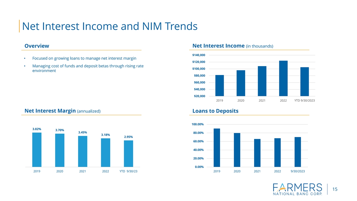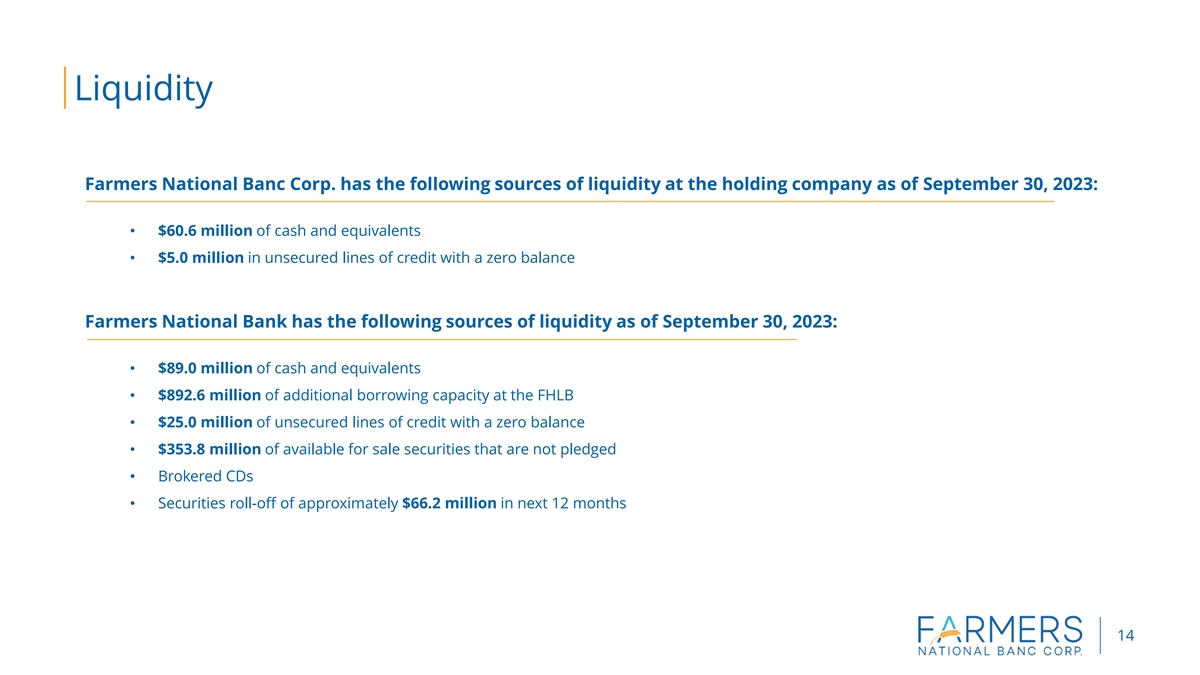 Liquidity Farmers National Banc Corp. has the following sources of liquidity at the holding company as of September 30, 2023: • $60.6 million of cash and equivalents • $5.0 million in unsecured lines of credit with a zero balance Farmers National Bank has the following sources of liquidity as of September 30, 2023: • $89.0 million of cash and equivalents • $892.6 million of additional borrowing capacity at the FHLB • $25.0 million of unsecured lines of credit with a zero balance • $353.8 million of available for sale securities that are not pledged • Brokered CDs • Securities roll-off of approximately $66.2 million in next 12 months 14