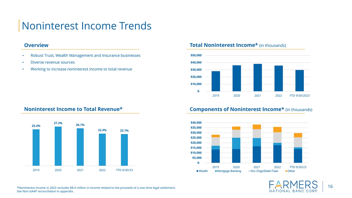 Net Interest Income and NIM Trends Overview Net Interest Income (in thousands) $140,000 • Focused on growing loans to manage net interest margin $120,000 • Managing cost of funds and deposit betas through rising rate $100,000 environment $80,000 $60,000 $40,000 $20,000 2019 2020 2021 2022 YTD 9/30/2023 Net Interest Margin (annualized) Loans to Deposits 100.00% 3.82% 3.70% 3.45% 80.00% 3.18% 2.95% 60.00% 40.00% 20.00% 0.00% 2019 2020 2021 2022 YTD 9/30/23 2019 2020 2021 2022 9/30/2023 15