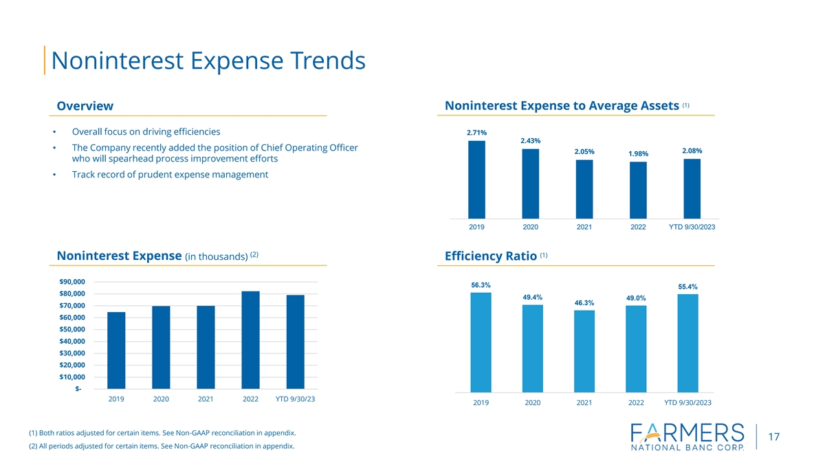 Noninterest Income Trends Overview Total Noninterest Income* (in thousands) $50,000 • Robust Trust, Wealth Management and Insurance businesses $40,000 • Diverse revenue sources • Working to increase noninterest income to total revenue $30,000 $20,000 $10,000 $- 2019 2020 2021 2022 YTD 9/30/2023 Noninterest Income to Total Revenue* Components of Noninterest Income* (in thousands) $40,000 27.3% 26.1% 25.4% $35,000 22.4% 22.1% $30,000 $25,000 $20,000 $15,000 $10,000 $5,000 $- 2019 2020 2021 2022 YTD 9/30/23 2019 2020 2021 2022 YTD 9/30/23 Wealth Mortgage Banking Svc Chgs/Debit Fees Other 16 *Noninterest income in 2022 excludes $8.4 million in income related to the proceeds of a one-time legal settlement. See Non-GAAP reconciliation in appendix.