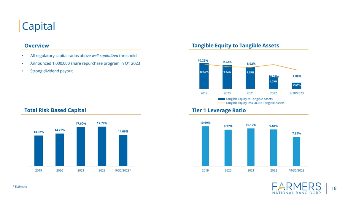 Noninterest Expense Trends 1) (1) Overview Noninterest Expense to Average Assets • Overall focus on driving efficiencies 2.71% 2.43% • The Company recently added the position of Chief Operating Officer 2.08% 2.05% 1.98% who will spearhead process improvement efforts • Track record of prudent expense management 2019 2020 2021 2022 YTD 9/30/2023 (2) (1) Noninterest Expense (in thousands) Efficiency Ratio $90,000 56.3% 55.4% $80,000 49.4% 49.0% 46.3% $70,000 $60,000 $50,000 $40,000 $30,000 $20,000 $10,000 $- 2019 2020 2021 2022 YTD 9/30/23 2019 2020 2021 2022 YTD 9/30/2023 (1) Both ratios adjusted for certain items. See Non-GAAP reconciliation in appendix. 17 (2) All periods adjusted for certain items. See Non-GAAP reconciliation in appendix.