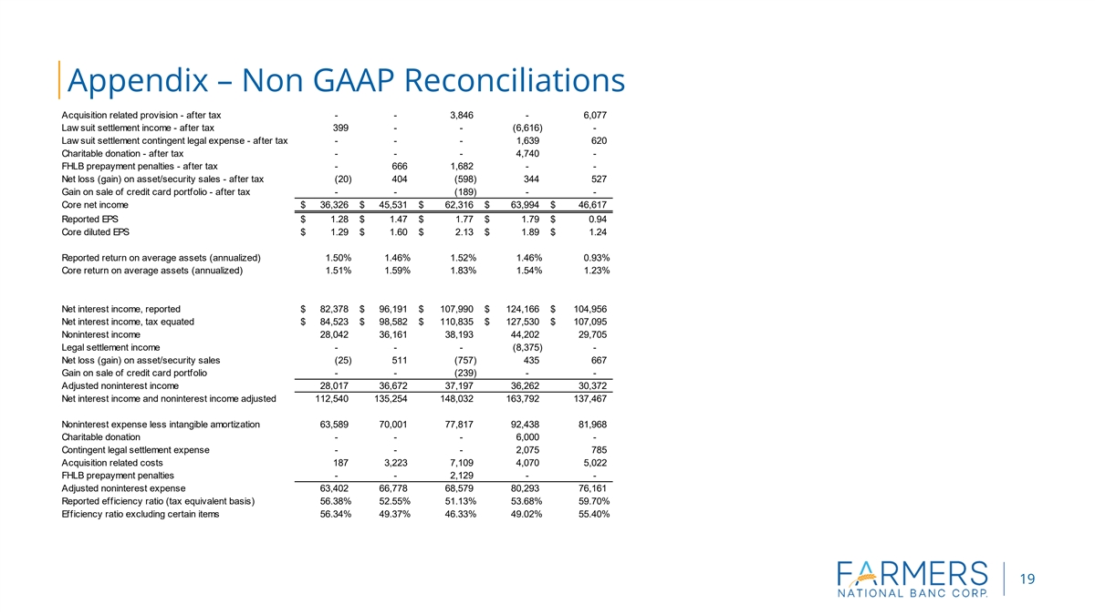Appendix – Non GAAP Reconciliations Acquisition related provision - after tax - - 3,846 - 6,077 Law suit settlement income - after tax 399 - - ( 6,616) - Law suit settlement contingent legal expense - after tax - - - 1,639 620 Charitable donation - after tax - - - 4,740 - FHLB prepayment penalties - after tax - 666 1,682 - - Net loss (gain) on asset/security sales - after tax (20) 404 (598) 344 527 Gain on sale of credit card portfolio - after tax - - (189) - - Core net income $ 36,326 $ 45,531 $ 62,316 $ 63,994 $ 46,617 Reported EPS $ 1.28 $ 1.47 $ 1.77 $ 1.79 $ 0 .94 Core diluted EPS $ 1.29 $ 1.60 $ 2.13 $ 1.89 $ 1 .24 Reported return on average assets (annualized) 1.50% 1.46% 1.52% 1.46% 0.93% Core return on average assets (annualized) 1.51% 1.59% 1.83% 1.54% 1.23% Net interest income, reported $ 82,378 $ 96,191 $ 107,990 $ 124,166 $ 104,956 Net interest income, tax equated $ 84,523 $ 98,582 $ 110,835 $ 127,530 $ 107,095 Noninterest income 28,042 36,161 38,193 44,202 2 9,705 Legal settlement income - - - ( 8,375) - Net loss (gain) on asset/security sales (25) 511 ( 757) 435 667 Gain on sale of credit card portfolio - - ( 239) - - Adjusted noninterest income 28,017 36,672 37,197 36,262 30,372 Net interest income and noninterest income adjusted 112,540 135,254 148,032 163,792 1 37,467 Noninterest expense less intangible amortization 63,589 70,001 77,817 92,438 8 1,968 Charitable donation - - - 6,000 - Contingent legal settlement expense - - - 2,075 785 Acquisition related costs 187 3,223 7,109 4,070 5,022 FHLB prepayment penalties - - 2,129 - - Adjusted noninterest expense 63,402 66,778 68,579 80,293 7 6,161 Reported efficiency ratio (tax equivalent basis) 56.38% 52.55% 51.13% 53.68% 59.70% Efficiency ratio excluding certain items 56.34% 49.37% 46.33% 49.02% 55.40% 19