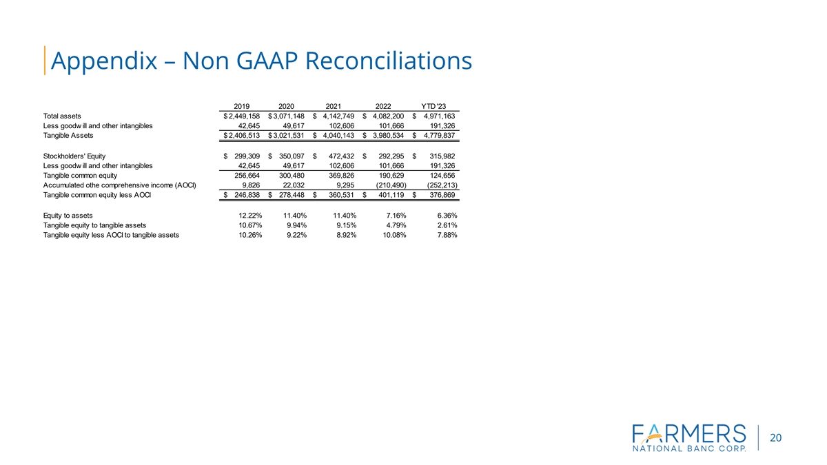 Appendix – Non GAAP Reconciliations 2019 2020 2021 2022 YTD '23 Total assets $ 2,449,158 $ 3,071,148 $ 4,142,749 $ 4,082,200 $ 4 ,971,163 Less goodw ill and other intangibles 42,645 49,617 102,606 101,666 191,326 Tangible Assets $ 2,406,513 $ 3,021,531 $ 4,040,143 $ 3,980,534 $ 4,779,837 Stockholders' Equity $ 299,309 $ 350,097 $ 472,432 $ 292,295 $ 315,982 Less goodw ill and other intangibles 42,645 49,617 102,606 101,666 1 91,326 Tangible common equity 256,664 300,480 369,826 190,629 1 24,656 Accumulated othe comprehensive income (AOCI) 9,826 22,032 9,295 (210,490) (252,213) Tangible common equity less AOCI $ 246,838 $ 278,448 $ 360,531 $ 401,119 $ 3 76,869 Equity to assets 12.22% 11.40% 11.40% 7.16% 6.36% Tangible equity to tangible assets 10.67% 9.94% 9.15% 4.79% 2.61% Tangible equity less AOCI to tangible assets 10.26% 9.22% 8.92% 10.08% 7.88% 20