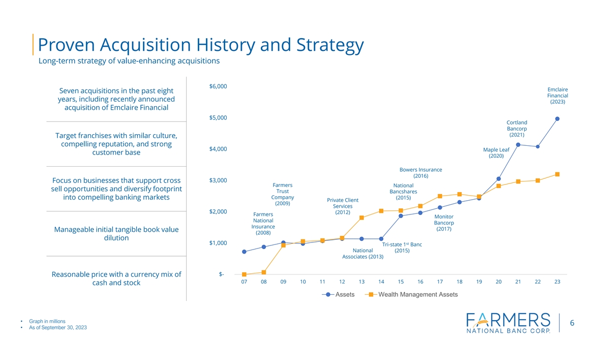 Farmers Strategic Vision Leveraging our History with Modern Banking Technologies to Support our Future Invest in our Franchise Drive Financial Excellence • Leverage technology• Strive for performance metrics in top quartile ranking vs. peer group • Drive efficiencies through Six Sigma operating framework• Focus on growing noninterest income • Strive to be customer centric and provide exceptional experiences • Proactive capital management • Assure Farmers is the best place to work • Maintain financial strength • Continued pursuit of organic and M&A opportunities • Prudent risk management and focus on asset quality 5