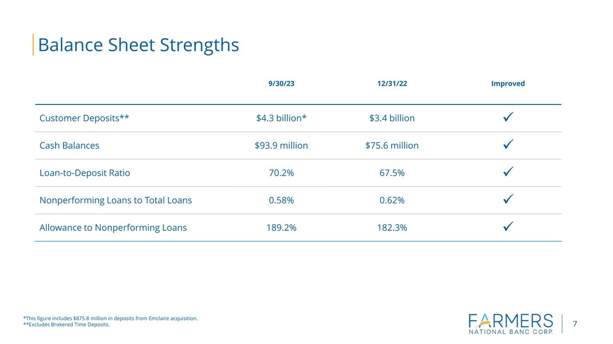 Proven Acquisition History and Strategy Long-term strategy of value-enhancing acquisitions $6,000 Emclaire Seven acquisitions in the past eight Financial years, including recently announced (2023) acquisition of Emclaire Financial $5,000 Cortland Bancorp (2021) Target franchises with similar culture, compelling reputation, and strong $4,000 Maple Leaf customer base (2020) Bowers Insurance (2016) $3,000 Focus on businesses that support cross Farmers National sell opportunities and diversify footprint Trust Bancshares into compelling banking markets Company (2015) Private Client (2009) Services $2,000 (2012) Farmers Monitor National Bancorp Insurance (2017) Manageable initial tangible book value (2008) dilution $1,000 st Tri-state 1 Banc National (2015) Associates (2013) $- Reasonable price with a currency mix of 07 08 09 10 11 12 13 14 15 16 17 18 19 20 21 22 23 cash and stock Assets Wealth Management Assets • Graph in millions 6 • As of September 30, 2023