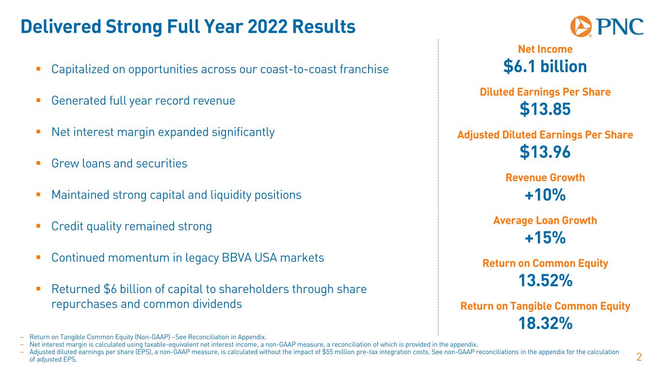 Cautionary Statement Regarding Forward-Looking and non-GAAP Financial Information Our earnings conference call presentation is not intended as a full business or financial review and should be viewed in the context of all of the information made available by PNC in its SEC filings and on our corporate website. The presentation contains forward-looking statements regarding our outlook for financial performance, such as earnings, revenues, expenses, tax rates, capital and liquidity levels and ratios, asset levels, asset quality, financial position, and other matters regarding or affecting PNC and its future business and operations, including sustainability strategy. Forward-looking statements are necessarily subject to numerous assumptions, risks and uncertainties, which change over time. The forward- looking statements in this presentation are qualified by the factors affecting forward-looking statements identified in the more detailed Cautionary Statement included in the Appendix. We provide greater detail regarding these as well as other factors in our 2021 Form 10-K and our subsequent form 10-Qs, and in our other subsequent SEC filings. Our forward-looking statements may also be subject to risks and uncertainties including those we may discuss in this presentation or in our SEC filings. Future events or circumstances may change our outlook and may also affect the nature of the assumptions, risks and uncertainties to which our forward-looking statements are subject. Forward-looking statements in this presentation speak only as of the date of this presentation. We do not assume any duty and do not undertake any obligation to update those statements. Actual results or future events could differ, possibly materially, from those anticipated in forward-looking statements, as well as from historical performance. As a result, we caution against placing undue reliance on any forward-looking statements. We include non-GAAP financial information in this presentation. Non-GAAP financial information includes adjusted financial metrics such as fee income, tangible book value, pretax, pre-provision earnings, net interest margin, and other adjusted metrics (including adjustments for merger and integration costs). Reconciliations for such financial information may be found in our presentation, in these slides, including the Appendix, in other materials on our corporate website, and in our SEC filings. This information supplements our results as reported in accordance with GAAP and should not be viewed in isolation from, or as a substitute for, our GAAP results. We believe that this information and the related reconciliations may be useful to investors, analysts, regulators and others to help understand and evaluate our financial results, and with respect to adjusted metrics, because we believe they better reflect the ongoing financial results and trends of our businesses and increase comparability of period-to-period results. We may also use annualized, pro forma, estimated or third party numbers for illustrative or comparative purposes only. These may not reflect actual results. References to our corporate website are to www.pnc.com under “About Us - Investor Relations.” Our SEC filings are available both on our corporate website and on the SEC’s website at www.sec.gov. We include web addresses here as inactive textual references only. Information on these websites is not part of this presentation. 1