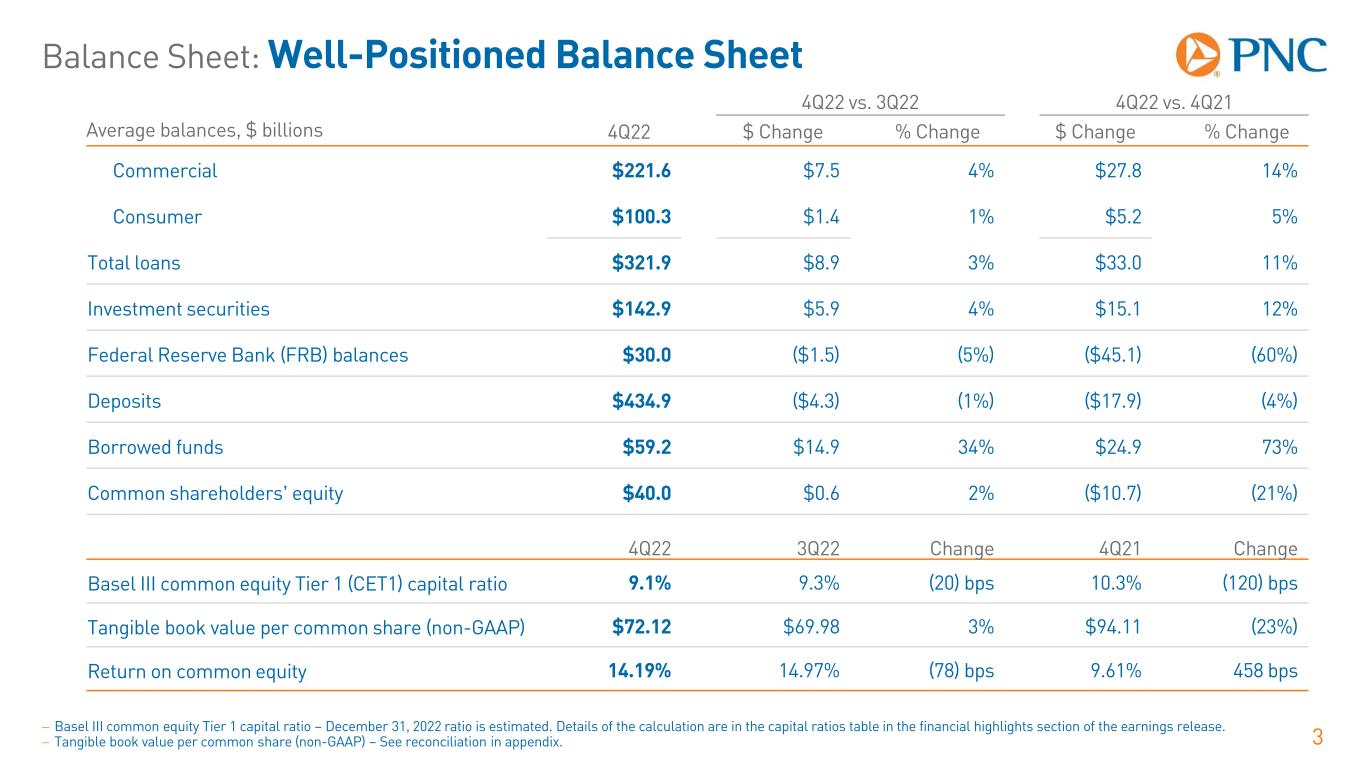 Delivered Strong Full Year 2022 Results 2  Capitalized on opportunities across our coast-to-coast franchise  Generated full year record revenue  Net interest margin expanded significantly  Grew loans and securities  Maintained strong capital and liquidity positions  Credit quality remained strong  Continued momentum in legacy BBVA USA markets  Returned $6 billion of capital to shareholders through share repurchases and common dividends Net Income $6.1 billion Diluted Earnings Per Share $13.85 Revenue Growth +10% Average Loan Growth +15% Return on Common Equity 13.52% – Return on Tangible Common Equity (Non-GAAP) –See Reconciliation in Appendix. – Net interest margin is calculated using taxable-equivalent net interest income, a non-GAAP measure, a reconciliation of which is provided in the appendix. – Adjusted diluted earnings per share (EPS), a non-GAAP measure, is calculated without the impact of $55 million pre-tax integration costs. See non-GAAP reconciliations in the appendix for the calculation of adjusted EPS. Adjusted Diluted Earnings Per Share $13.96 Return on Tangible Common Equity 18.32%