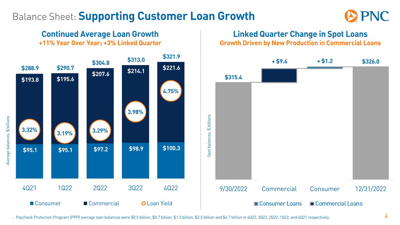 Balance Sheet: Well-Positioned Balance Sheet 3 4Q22 vs. 3Q22 4Q22 vs. 4Q21 Average balances, $ billions 4Q22 $ Change % Change $ Change % Change Commercial $221.6 $7.5 4% $27.8 14% Consumer $100.3 $1.4 1% $5.2 5% Total loans $321.9 $8.9 3% $33.0 11% Investment securities $142.9 $5.9 4% $15.1 12% Federal Reserve Bank (FRB) balances $30.0 ($1.5) (5%) ($45.1) (60%) Deposits $434.9 ($4.3) (1%) ($17.9) (4%) Borrowed funds $59.2 $14.9 34% $24.9 73% Common shareholders’ equity $40.0 $0.6 2% ($10.7) (21%) 4Q22 3Q22 Change 4Q21 Change Basel III common equity Tier 1 (CET1) capital ratio 9.1% 9.3% (20) bps 10.3% (120) bps Tangible book value per common share (non-GAAP) $72.12 $69.98 3% $94.11 (23%) Return on common equity 14.19% 14.97% (78) bps 9.61% 458 bps − Basel III common equity Tier 1 capital ratio – December 31, 2022 ratio is estimated. Details of the calculation are in the capital ratios table in the financial highlights section of the earnings release. − Tangible book value per common share (non-GAAP) – See reconciliation in appendix.