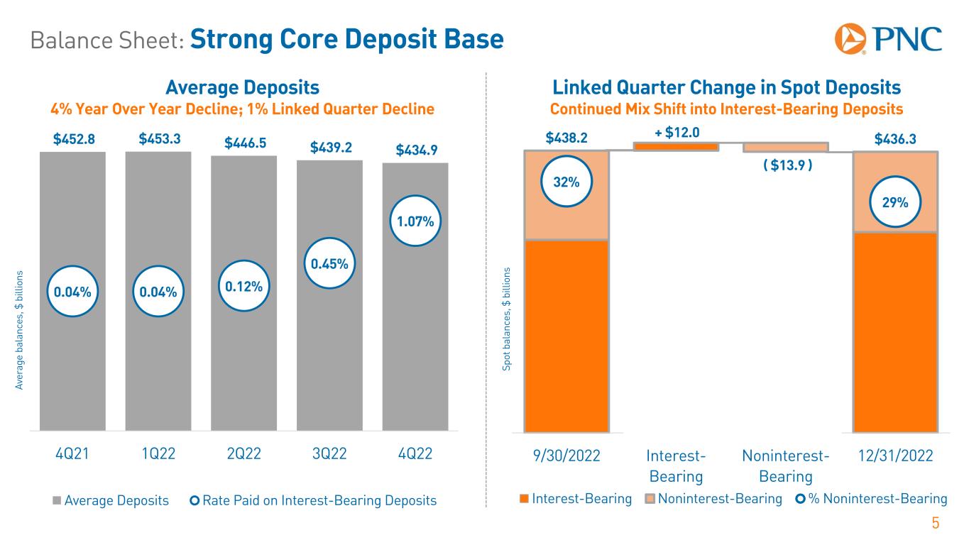 + $9.4 + $1.2 $315.4 $326.0 250 260 270 280 290 300 310 320 330 9/30/2022 Commercial Consumer 12/31/2022 Balance Sheet: Supporting Customer Loan Growth 4 Av er ag e ba la nc es , $ b ill io ns Continued Average Loan Growth +11% Year Over Year; +3% Linked Quarter Linked Quarter Change in Spot Loans Growth Driven by New Production in Commercial Loans − Paycheck Protection Program (PPP) average loan balances were $0.5 billion, $0.7 billion, $1.3 billion, $2.5 billion and $4.7 billion in 4Q22, 3Q22, 2Q22, 1Q22, and 4Q21 respectively. $95.1 $95.1 $97.2 $98.9 $100.3 $193.8 $195.6 $207.6 $214.1 $221.6 $288.9 $290.7 $304.8 $313.0 $321.9 3.32% 3.19% 3.29% 3.98% 4.75% 1.50 % 2.00 % 2.50 % 3.00 % 3.50 % 4.00 % 4.50 % 5.00 % 5.50 % 6.00 % $- $50.0 $100.0 $150.0 $200.0 $250.0 $300.0 4Q21 1Q22 2Q22 3Q22 4Q22 Consumer Commercial Loan Yield Sp ot b al an ce s, $ b ill io ns