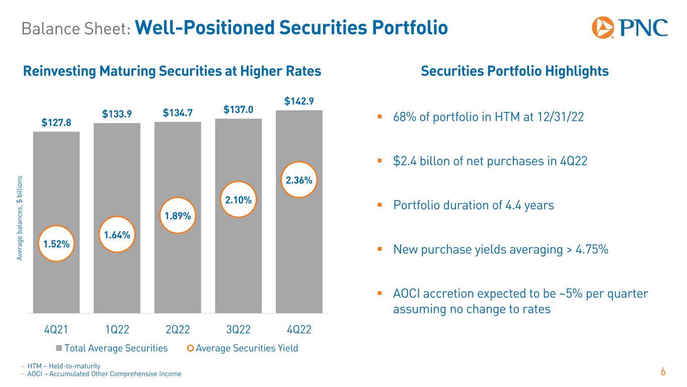 + $12.0 ( $13.9 ) $438.2 $436.3 32% 29% $- $50.0 $100.0 $150.0 $200.0 $250.0 $300.0 $350.0 $400.0 $450.0 9/30/2022 Interest- Bearing Noninterest- Bearing 12/31/2022 Interest-Bearing Noninterest-Bearing % Noninterest-Bearing $452.8 $453.3 $446.5 $439.2 $434.9 0.04% 0.04% 0.12% 0.45% 1.07% 4Q21 1Q22 2Q22 3Q22 4Q22 Average Deposits Rate Paid on Interest-Bearing Deposits Balance Sheet: Strong Core Deposit Base 5 Average Deposits 4% Year Over Year Decline; 1% Linked Quarter Decline Av er ag e ba la nc es , $ b ill io ns Linked Quarter Change in Spot Deposits Continued Mix Shift into Interest-Bearing Deposits Sp ot b al an ce s, $ b ill io ns