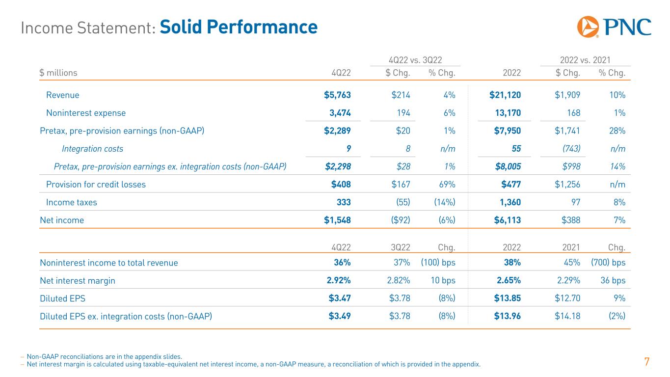 Balance Sheet: Well-Positioned Securities Portfolio 6 Securities Portfolio Highlights Av er ag e ba la nc es , $ b ill io ns Reinvesting Maturing Securities at Higher Rates $127.8 $133.9 $134.7 $137.0 $142.9 1.52% 1.64% 1.89% 2.10% 2.36% 0 20 40 60 80 100 120 140 4Q21 1Q22 2Q22 3Q22 4Q22 Total Average Securities Average Securities Yield  68% of portfolio in HTM at 12/31/22  $2.4 billon of net purchases in 4Q22  Portfolio duration of 4.4 years  New purchase yields averaging > 4.75%  AOCI accretion expected to be ~5% per quarter assuming no change to rates − HTM – Held-to-maturity − AOCI – Accumulated Other Comprehensive Income