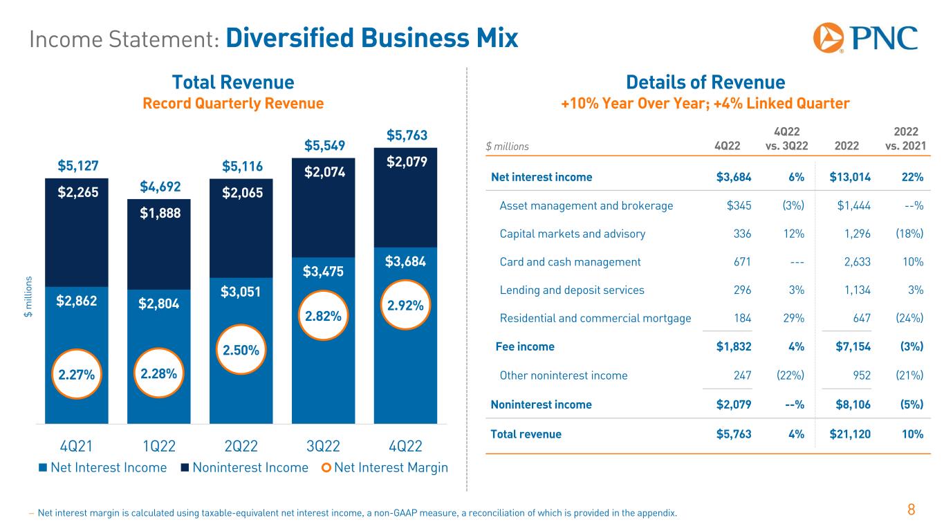 Income Statement: Solid Performance 7− Non-GAAP reconciliations are in the appendix slides. − Net interest margin is calculated using taxable-equivalent net interest income, a non-GAAP measure, a reconciliation of which is provided in the appendix. 4Q22 vs. 3Q22 2022 vs. 2021 $ millions 4Q22 $ Chg. % Chg. 2022 $ Chg. % Chg. Revenue $5,763 $214 4% $21,120 $1,909 10% Noninterest expense 3,474 194 6% 13,170 168 1% Pretax, pre-provision earnings (non-GAAP) $2,289 $20 1% $7,950 $1,741 28% Integration costs 9 8 n/m 55 (743) n/m Pretax, pre-provision earnings ex. integration costs (non-GAAP) $2,298 $28 1% $8,005 $998 14% Provision for credit losses $408 $167 69% $477 $1,256 n/m Income taxes 333 (55) (14%) 1,360 97 8% Net income $1,548 ($92) (6%) $6,113 $388 7% 4Q22 3Q22 Chg. 2022 2021 Chg. Noninterest income to total revenue 36% 37% (100) bps 38% 45% (700) bps Net interest margin 2.92% 2.82% 10 bps 2.65% 2.29% 36 bps Diluted EPS $3.47 $3.78 (8%) $13.85 $12.70 9% Diluted EPS ex. integration costs (non-GAAP) $3.49 $3.78 (8%) $13.96 $14.18 (2%)