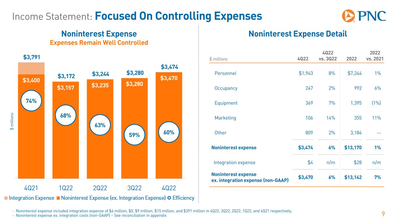 Income Statement: Diversified Business Mix 8 Total Revenue Record Quarterly Revenue Details of Revenue +10% Year Over Year; +4% Linked Quarter $ m ill io ns − Net interest margin is calculated using taxable-equivalent net interest income, a non-GAAP measure, a reconciliation of which is provided in the appendix. $2,862 $2,804 $3,051 $3,475 $3,684 $2,265 $1,888 $2,065 $2,074 $2,079 $5,127 $4,692 $5,116 $5,549 $5,763 2.27% 2.28% 2.50% 2.82% 2.92% 1.80 % 2.30 % 2.80 % 3.30 % 3.80 % 4.30 % 0 100 0 200 0 300 0 400 0 500 0 600 0 4Q21 1Q22 2Q22 3Q22 4Q22 Net Interest Income Noninterest Income Net Interest Margin $ millions 4Q22 4Q22 vs. 3Q22 2022 2022 vs. 2021 Net interest income $3,684 6% $13,014 22% Asset management and brokerage $345 (3%) $1,444 --% Capital markets and advisory 336 12% 1,296 (18%) Card and cash management 671 --- 2,633 10% Lending and deposit services 296 3% 1,134 3% Residential and commercial mortgage 184 29% 647 (24%) Fee income $1,832 4% $7,154 (3%) Other noninterest income 247 (22%) 952 (21%) Noninterest income $2,079 --% $8,106 (5%) Total revenue $5,763 4% $21,120 10%