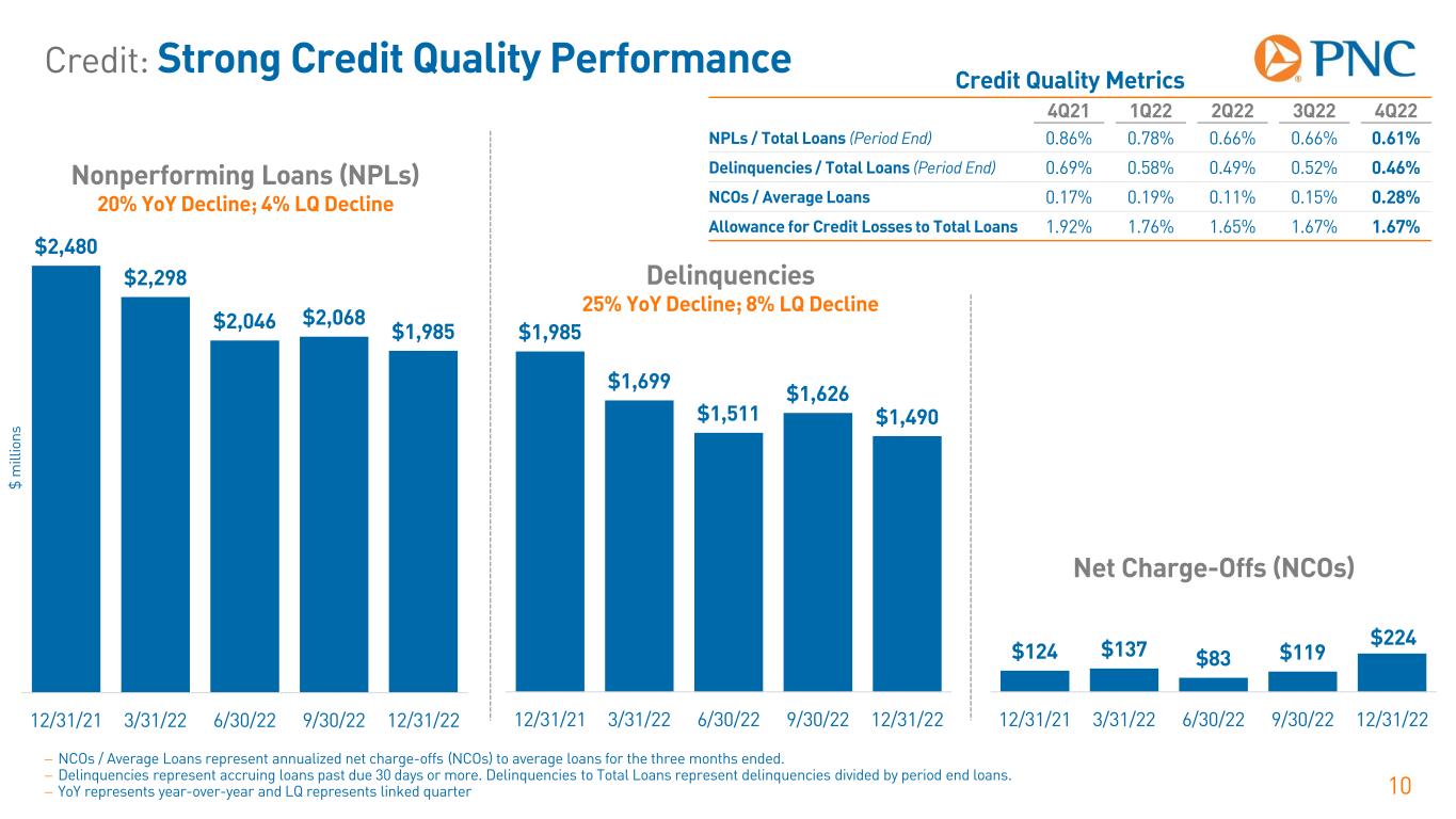 Income Statement: Focused On Controlling Expenses 9 $3,400 $3,157 $3,235 $3,280 $3,470 $3,791 $3,172 $3,244 $3,280 $3,474 74% 68% 63% 59% 60% 4Q21 1Q22 2Q22 3Q22 4Q22 Noninterest Expense Expenses Remain Well Controlled − Noninterest expense included integration expense of $4 million, $0, $9 million, $15 million, and $391 million in 4Q22, 3Q22, 2Q22, 1Q22, and 4Q21 respectively. − Noninterest expense ex. integration costs (non-GAAP) – See reconciliation in appendix $ m ill io ns Noninterest Expense Detail $ millions 4Q22 4Q22 vs. 3Q22 2022 2022 vs. 2021 Personnel $1,943 8% $7,244 1% Occupancy 247 2% 992 6% Equipment 369 7% 1,395 (1%) Marketing 106 14% 355 11% Other 809 2% 3,184 -- Noninterest expense $3,474 6% $13,170 1% Integration expense $4 n/m $28 n/m Noninterest expense ex. integration expense (non-GAAP) $3,470 6% $13,142 7%