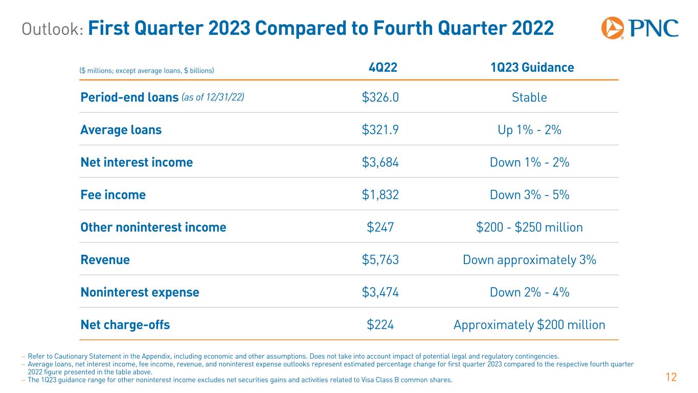 Outlook: Full Year 2023 Compared to Full Year 2022 11 − Refer to Cautionary Statement in the Appendix, including economic and other assumptions. Does not take into account impact of potential legal and regulatory contingencies. − Average loans, period-end loans, revenue, and noninterest expense outlooks represent estimated percentage change for full year 2023 compared to the respective full year 2022 figure presented in the table above. ($ millions; except loans, $ billions) 2022 2023 Guidance Period-end loans (as of 12/31/22) $326.0 Up 2% - 4% Average loans $307.7 Up 6% - 8% Revenue $21,120 Up 6% - 8% Noninterest expense $13,170 Up 2% - 4% Effective tax rate 18.2% 18%