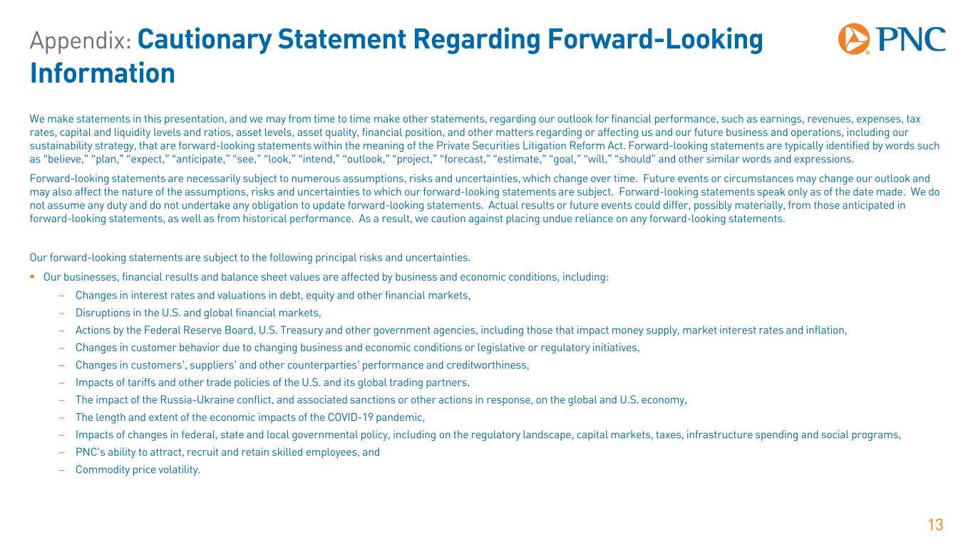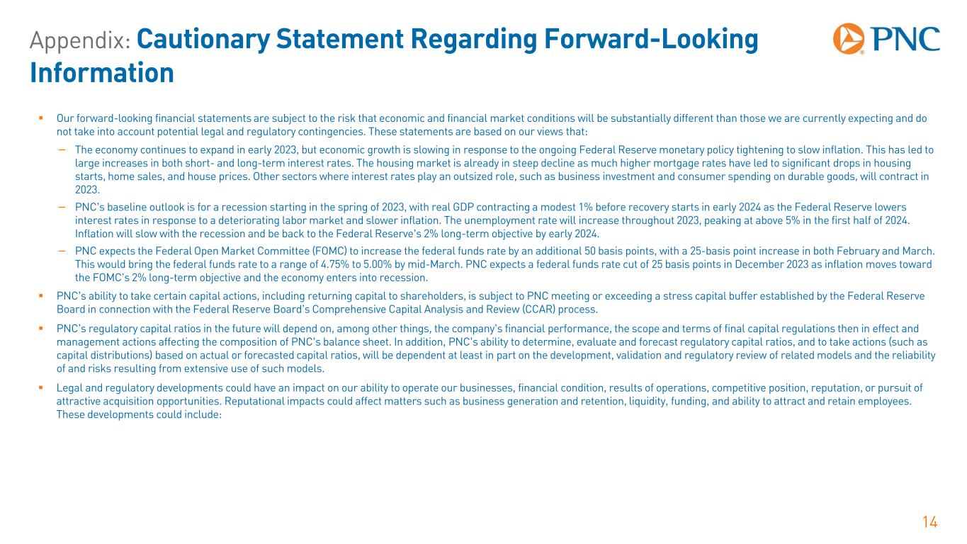 Appendix: Cautionary Statement Regarding Forward-Looking Information 13 We make statements in this presentation, and we may from time to time make other statements, regarding our outlook for financial performance, such as earnings, revenues, expenses, tax rates, capital and liquidity levels and ratios, asset levels, asset quality, financial position, and other matters regarding or affecting us and our future business and operations, including our sustainability strategy, that are forward-looking statements within the meaning of the Private Securities Litigation Reform Act. Forward-looking statements are typically identified by words such as “believe,” “plan,” “expect,” “anticipate,” “see,” “look,” “intend,” “outlook,” “project,” “forecast,” “estimate,” “goal,” “will,” “should” and other similar words and expressions. Forward-looking statements are necessarily subject to numerous assumptions, risks and uncertainties, which change over time. Future events or circumstances may change our outlook and may also affect the nature of the assumptions, risks and uncertainties to which our forward-looking statements are subject. Forward-looking statements speak only as of the date made. We do not assume any duty and do not undertake any obligation to update forward-looking statements. Actual results or future events could differ, possibly materially, from those anticipated in forward-looking statements, as well as from historical performance. As a result, we caution against placing undue reliance on any forward-looking statements. Our forward-looking statements are subject to the following principal risks and uncertainties.  Our businesses, financial results and balance sheet values are affected by business and economic conditions, including: − Changes in interest rates and valuations in debt, equity and other financial markets, − Disruptions in the U.S. and global financial markets, − Actions by the Federal Reserve Board, U.S. Treasury and other government agencies, including those that impact money supply, market interest rates and inflation, − Changes in customer behavior due to changing business and economic conditions or legislative or regulatory initiatives, − Changes in customers’, suppliers’ and other counterparties’ performance and creditworthiness, − Impacts of tariffs and other trade policies of the U.S. and its global trading partners, − The impact of the Russia-Ukraine conflict, and associated sanctions or other actions in response, on the global and U.S. economy, − The length and extent of the economic impacts of the COVID-19 pandemic, − Impacts of changes in federal, state and local governmental policy, including on the regulatory landscape, capital markets, taxes, infrastructure spending and social programs, − PNC’s ability to attract, recruit and retain skilled employees, and − Commodity price volatility.