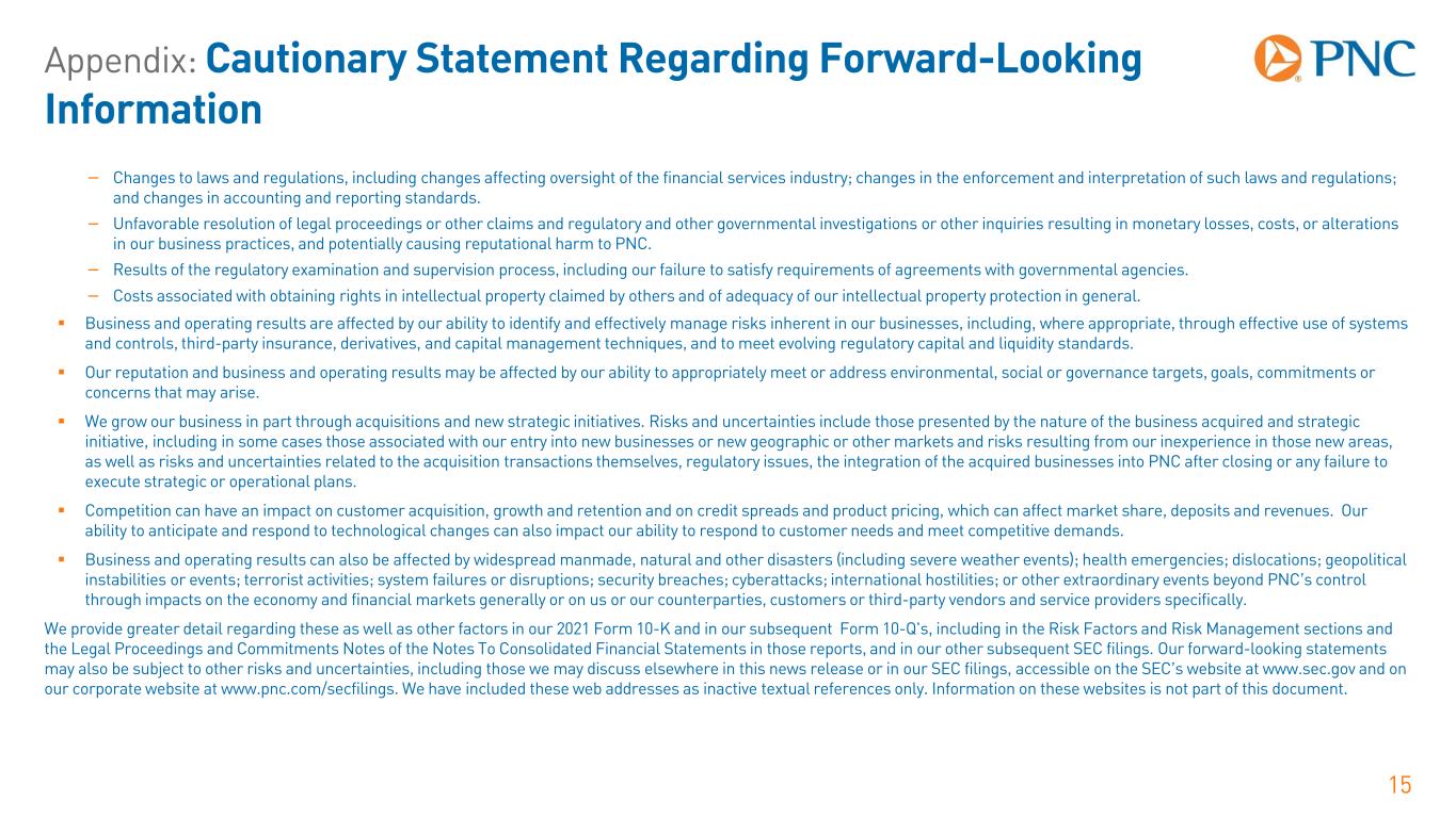 Appendix: Cautionary Statement Regarding Forward-Looking Information 14  Our forward-looking financial statements are subject to the risk that economic and financial market conditions will be substantially different than those we are currently expecting and do not take into account potential legal and regulatory contingencies. These statements are based on our views that: − The economy continues to expand in early 2023, but economic growth is slowing in response to the ongoing Federal Reserve monetary policy tightening to slow inflation. This has led to large increases in both short- and long-term interest rates. The housing market is already in steep decline as much higher mortgage rates have led to significant drops in housing starts, home sales, and house prices. Other sectors where interest rates play an outsized role, such as business investment and consumer spending on durable goods, will contract in 2023. − PNC’s baseline outlook is for a recession starting in the spring of 2023, with real GDP contracting a modest 1% before recovery starts in early 2024 as the Federal Reserve lowers interest rates in response to a deteriorating labor market and slower inflation. The unemployment rate will increase throughout 2023, peaking at above 5% in the first half of 2024. Inflation will slow with the recession and be back to the Federal Reserve’s 2% long-term objective by early 2024. − PNC expects the Federal Open Market Committee (FOMC) to increase the federal funds rate by an additional 50 basis points, with a 25-basis point increase in both February and March. This would bring the federal funds rate to a range of 4.75% to 5.00% by mid-March. PNC expects a federal funds rate cut of 25 basis points in December 2023 as inflation moves toward the FOMC's 2% long-term objective and the economy enters into recession.  PNC’s ability to take certain capital actions, including returning capital to shareholders, is subject to PNC meeting or exceeding a stress capital buffer established by the Federal Reserve Board in connection with the Federal Reserve Board’s Comprehensive Capital Analysis and Review (CCAR) process.  PNC’s regulatory capital ratios in the future will depend on, among other things, the company’s financial performance, the scope and terms of final capital regulations then in effect and management actions affecting the composition of PNC’s balance sheet. In addition, PNC’s ability to determine, evaluate and forecast regulatory capital ratios, and to take actions (such as capital distributions) based on actual or forecasted capital ratios, will be dependent at least in part on the development, validation and regulatory review of related models and the reliability of and risks resulting from extensive use of such models.  Legal and regulatory developments could have an impact on our ability to operate our businesses, financial condition, results of operations, competitive position, reputation, or pursuit of attractive acquisition opportunities. Reputational impacts could affect matters such as business generation and retention, liquidity, funding, and ability to attract and retain employees. These developments could include: