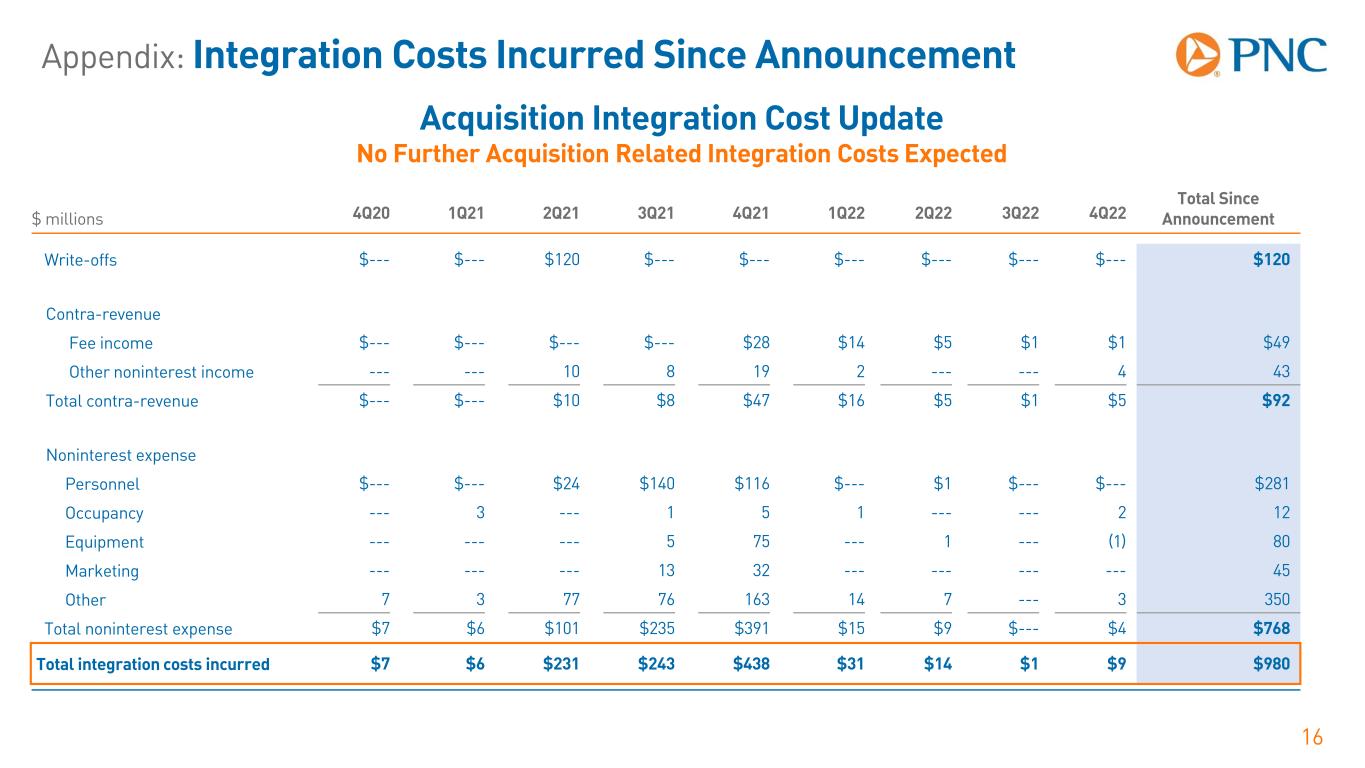 Appendix: Cautionary Statement Regarding Forward-Looking Information 15 − Changes to laws and regulations, including changes affecting oversight of the financial services industry; changes in the enforcement and interpretation of such laws and regulations; and changes in accounting and reporting standards. − Unfavorable resolution of legal proceedings or other claims and regulatory and other governmental investigations or other inquiries resulting in monetary losses, costs, or alterations in our business practices, and potentially causing reputational harm to PNC. − Results of the regulatory examination and supervision process, including our failure to satisfy requirements of agreements with governmental agencies. − Costs associated with obtaining rights in intellectual property claimed by others and of adequacy of our intellectual property protection in general.  Business and operating results are affected by our ability to identify and effectively manage risks inherent in our businesses, including, where appropriate, through effective use of systems and controls, third-party insurance, derivatives, and capital management techniques, and to meet evolving regulatory capital and liquidity standards.  Our reputation and business and operating results may be affected by our ability to appropriately meet or address environmental, social or governance targets, goals, commitments or concerns that may arise.  We grow our business in part through acquisitions and new strategic initiatives. Risks and uncertainties include those presented by the nature of the business acquired and strategic initiative, including in some cases those associated with our entry into new businesses or new geographic or other markets and risks resulting from our inexperience in those new areas, as well as risks and uncertainties related to the acquisition transactions themselves, regulatory issues, the integration of the acquired businesses into PNC after closing or any failure to execute strategic or operational plans.  Competition can have an impact on customer acquisition, growth and retention and on credit spreads and product pricing, which can affect market share, deposits and revenues. Our ability to anticipate and respond to technological changes can also impact our ability to respond to customer needs and meet competitive demands.  Business and operating results can also be affected by widespread manmade, natural and other disasters (including severe weather events); health emergencies; dislocations; geopolitical instabilities or events; terrorist activities; system failures or disruptions; security breaches; cyberattacks; international hostilities; or other extraordinary events beyond PNC’s control through impacts on the economy and financial markets generally or on us or our counterparties, customers or third-party vendors and service providers specifically. We provide greater detail regarding these as well as other factors in our 2021 Form 10-K and in our subsequent Form 10-Q's, including in the Risk Factors and Risk Management sections and the Legal Proceedings and Commitments Notes of the Notes To Consolidated Financial Statements in those reports, and in our other subsequent SEC filings. Our forward-looking statements may also be subject to other risks and uncertainties, including those we may discuss elsewhere in this news release or in our SEC filings, accessible on the SEC’s website at www.sec.gov and on our corporate website at www.pnc.com/secfilings. We have included these web addresses as inactive textual references only. Information on these websites is not part of this document.