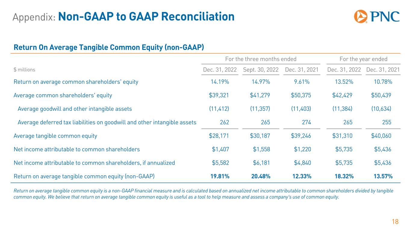 Appendix: Non-GAAP to GAAP Reconciliation 17 Tangible Book Value per Common Share (non-GAAP) For the three months ended $ millions, except per share data Dec. 31, 2022 Sept. 30, 2022 Dec. 31, 2021 Book value per common share $99.93 $97.59 $120.61 Tangible book value per common share Common shareholders’ equity $40,028 $39,444 $50,685 Goodwill and other intangible assets (11,400) (11,423) (11,406) Deferred tax liabilities on goodwill and other intangible assets 261 263 270 Tangible common shareholders' equity $28,889 $28,284 $39,549 Period-end common shares outstanding (in millions) 401 404 420 Tangible book value per common share (non-GAAP) $72.12 $69.98 $94.11 Tangible book value per common share is a non-GAAP measure and is calculated based on tangible common shareholders’ equity divided by period-end common shares outstanding. We believe this non-GAAP measure serves as a useful tool to help evaluate the strength and discipline of a company's capital management strategies and as an additional, conservative measure of total company value.