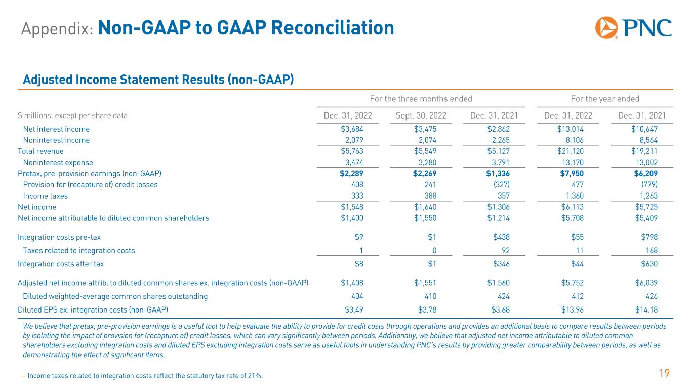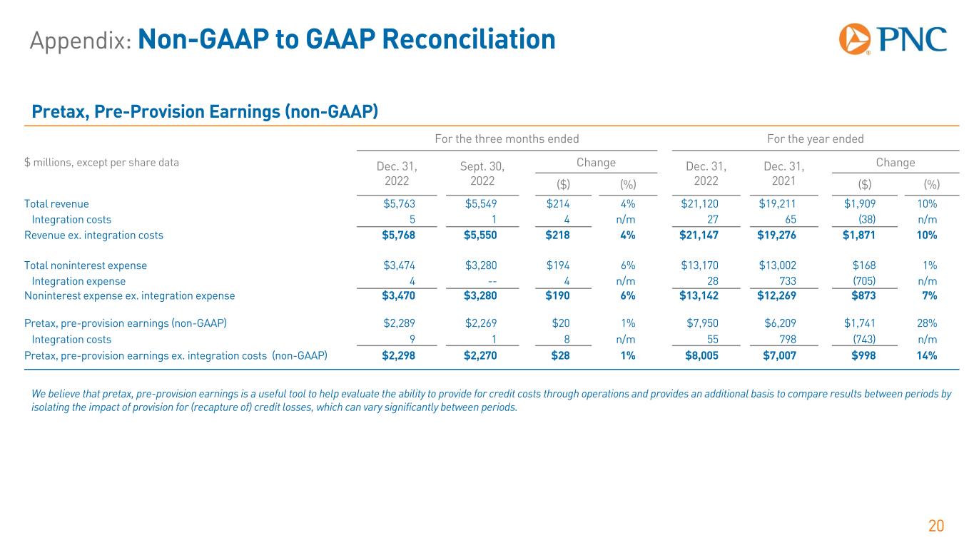 Appendix: Non-GAAP to GAAP Reconciliation 19− Income taxes related to integration costs reflect the statutory tax rate of 21%. Adjusted Income Statement Results (non-GAAP) For the three months ended For the year ended $ millions, except per share data Dec. 31, 2022 Sept. 30, 2022 Dec. 31, 2021 Dec. 31, 2022 Dec. 31, 2021 Net interest income $3,684 $3,475 $2,862 $13,014 $10,647 Noninterest income 2,079 2,074 2,265 8,106 8,564 Total revenue $5,763 $5,549 $5,127 $21,120 $19,211 Noninterest expense 3,474 3,280 3,791 13,170 13,002 Pretax, pre-provision earnings (non-GAAP) $2,289 $2,269 $1,336 $7,950 $6,209 Provision for (recapture of) credit losses 408 241 (327) 477 (779) Income taxes 333 388 357 1,360 1,263 Net income $1,548 $1,640 $1,306 $6,113 $5,725 Net income attributable to diluted common shareholders $1,400 $1,550 $1,214 $5,708 $5,409 Integration costs pre-tax $9 $1 $438 $55 $798 Taxes related to integration costs 1 0 92 11 168 Integration costs after tax $8 $1 $346 $44 $630 Adjusted net income attrib. to diluted common shares ex. integration costs (non-GAAP) $1,408 $1,551 $1,560 $5,752 $6,039 Diluted weighted-average common shares outstanding 404 410 424 412 426 Diluted EPS ex. integration costs (non-GAAP) $3.49 $3.78 $3.68 $13.96 $14.18 We believe that pretax, pre-provision earnings is a useful tool to help evaluate the ability to provide for credit costs through operations and provides an additional basis to compare results between periods by isolating the impact of provision for (recapture of) credit losses, which can vary significantly between periods. Additionally, we believe that adjusted net income attributable to diluted common shareholders excluding integration costs and diluted EPS excluding integration costs serve as useful tools in understanding PNC's results by providing greater comparability between periods, as well as demonstrating the effect of significant items.