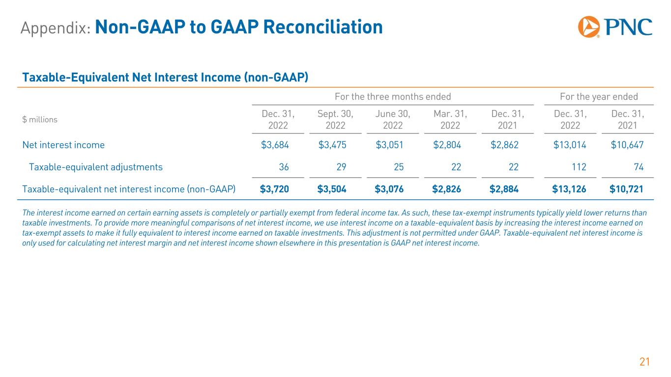 Appendix: Non-GAAP to GAAP Reconciliation 20 Pretax, Pre-Provision Earnings (non-GAAP) ` For the three months ended For the year ended $ millions, except per share data Dec. 31, 2022 Sept. 30, 2022 Change Dec. 31, 2022 Dec. 31, 2021 Change ($) (%) ($) (%) Total revenue $5,763 $5,549 $214 4% $21,120 $19,211 $1,909 10% Integration costs 5 1 4 n/m 27 65 (38) n/m Revenue ex. integration costs $5,768 $5,550 $218 4% $21,147 $19,276 $1,871 10% Total noninterest expense $3,474 $3,280 $194 6% $13,170 $13,002 $168 1% Integration expense 4 -- 4 n/m 28 733 (705) n/m Noninterest expense ex. integration expense $3,470 $3,280 $190 6% $13,142 $12,269 $873 7% Pretax, pre-provision earnings (non-GAAP) $2,289 $2,269 $20 1% $7,950 $6,209 $1,741 28% Integration costs 9 1 8 n/m 55 798 (743) n/m Pretax, pre-provision earnings ex. integration costs (non-GAAP) $2,298 $2,270 $28 1% $8,005 $7,007 $998 14% We believe that pretax, pre-provision earnings is a useful tool to help evaluate the ability to provide for credit costs through operations and provides an additional basis to compare results between periods by isolating the impact of provision for (recapture of) credit losses, which can vary significantly between periods.