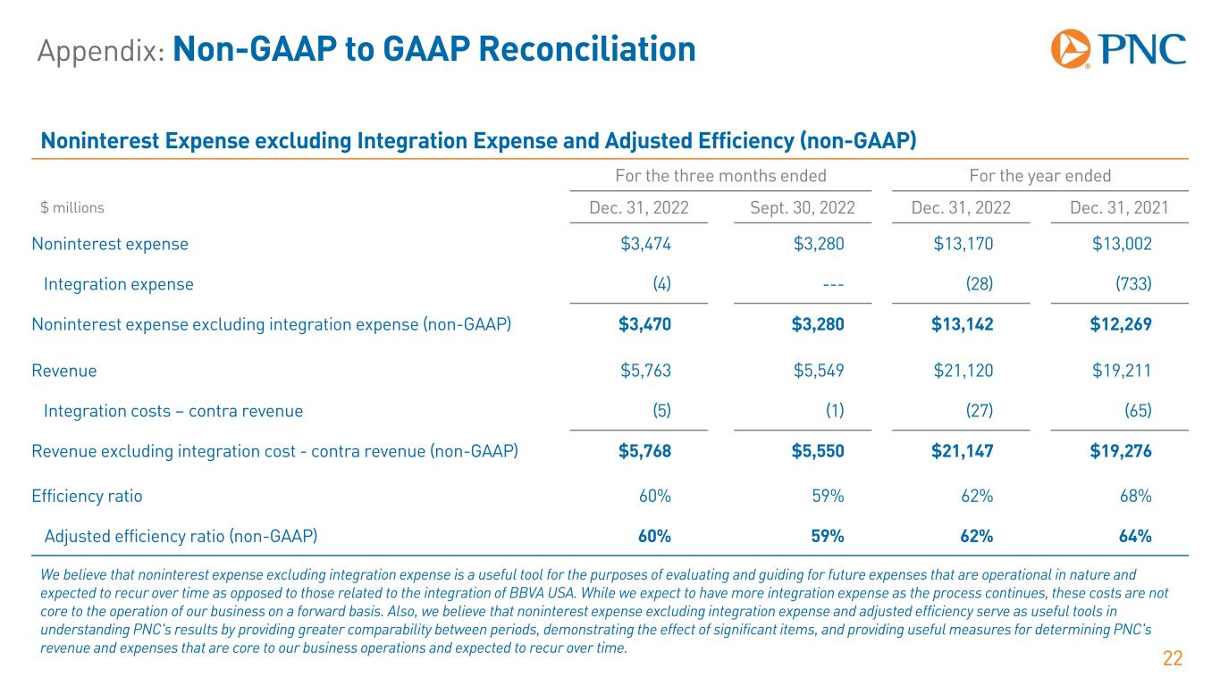 Appendix: Non-GAAP to GAAP Reconciliation 21 Taxable-Equivalent Net Interest Income (non-GAAP) For the three months ended For the year ended $ millions Dec. 31, 2022 Sept. 30, 2022 June 30, 2022 Mar. 31, 2022 Dec. 31, 2021 Dec. 31, 2022 Dec. 31, 2021 Net interest income $3,684 $3,475 $3,051 $2,804 $2,862 $13,014 $10,647 Taxable-equivalent adjustments 36 29 25 22 22 112 74 Taxable-equivalent net interest income (non-GAAP) $3,720 $3,504 $3,076 $2,826 $2,884 $13,126 $10,721 The interest income earned on certain earning assets is completely or partially exempt from federal income tax. As such, these tax-exempt instruments typically yield lower returns than taxable investments. To provide more meaningful comparisons of net interest income, we use interest income on a taxable-equivalent basis by increasing the interest income earned on tax-exempt assets to make it fully equivalent to interest income earned on taxable investments. This adjustment is not permitted under GAAP. Taxable-equivalent net interest income is only used for calculating net interest margin and net interest income shown elsewhere in this presentation is GAAP net interest income.