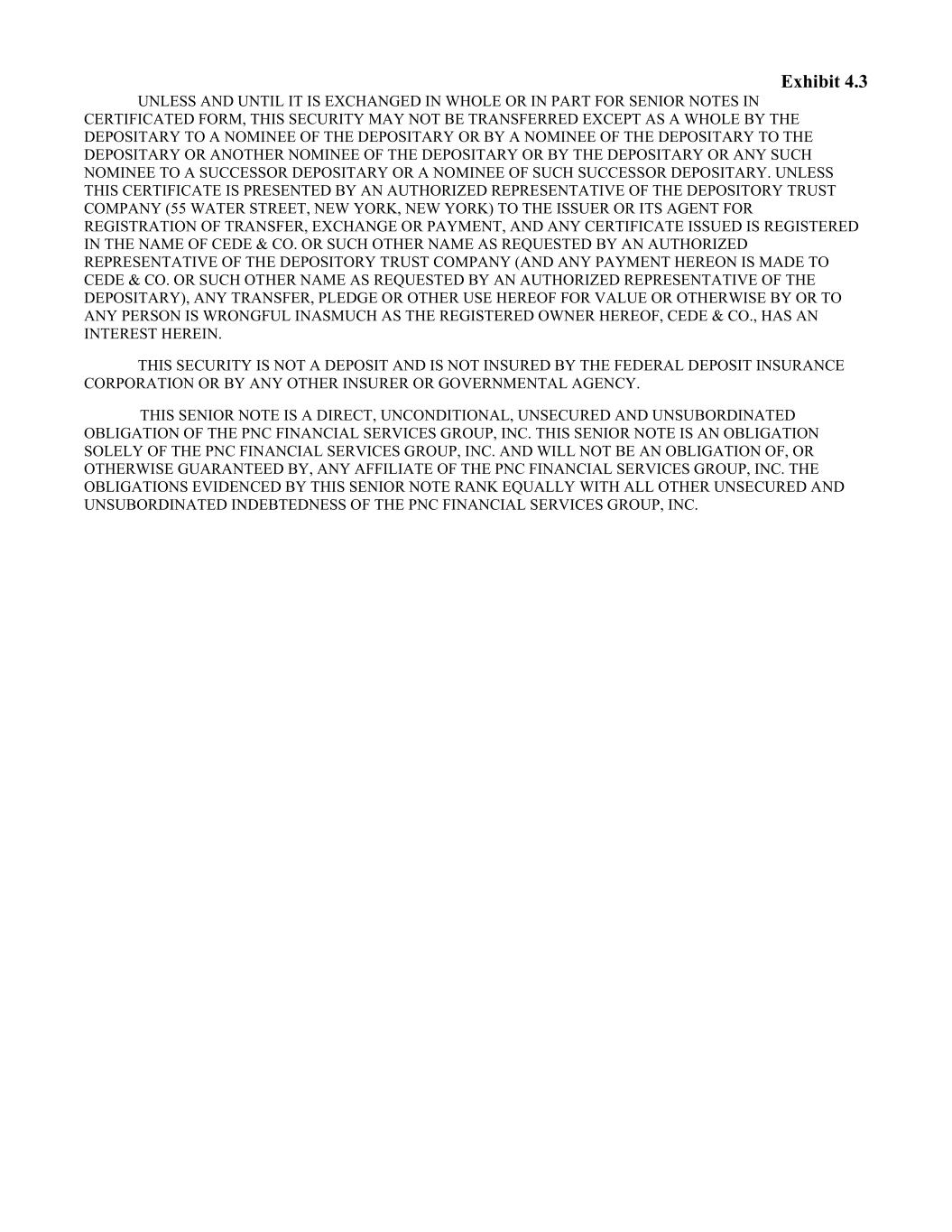 Exhibit 4.3 UNLESS AND UNTIL IT IS EXCHANGED IN WHOLE OR IN PART FOR SENIOR NOTES IN CERTIFICATED FORM, THIS SECURITY MAY NOT BE TRANSFERRED EXCEPT AS A WHOLE BY THE DEPOSITARY TO A NOMINEE OF THE DEPOSITARY OR BY A NOMINEE OF THE DEPOSITARY TO THE DEPOSITARY OR ANOTHER NOMINEE OF THE DEPOSITARY OR BY THE DEPOSITARY OR ANY SUCH NOMINEE TO A SUCCESSOR DEPOSITARY OR A NOMINEE OF SUCH SUCCESSOR DEPOSITARY. UNLESS THIS CERTIFICATE IS PRESENTED BY AN AUTHORIZED REPRESENTATIVE OF THE DEPOSITORY TRUST COMPANY (55 WATER STREET, NEW YORK, NEW YORK) TO THE ISSUER OR ITS AGENT FOR REGISTRATION OF TRANSFER, EXCHANGE OR PAYMENT, AND ANY CERTIFICATE ISSUED IS REGISTERED IN THE NAME OF CEDE & CO. OR SUCH OTHER NAME AS REQUESTED BY AN AUTHORIZED REPRESENTATIVE OF THE DEPOSITORY TRUST COMPANY (AND ANY PAYMENT HEREON IS MADE TO CEDE & CO. OR SUCH OTHER NAME AS REQUESTED BY AN AUTHORIZED REPRESENTATIVE OF THE DEPOSITARY), ANY TRANSFER, PLEDGE OR OTHER USE HEREOF FOR VALUE OR OTHERWISE BY OR TO ANY PERSON IS WRONGFUL INASMUCH AS THE REGISTERED OWNER HEREOF, CEDE & CO., HAS AN INTEREST HEREIN. THIS SECURITY IS NOT A DEPOSIT AND IS NOT INSURED BY THE FEDERAL DEPOSIT INSURANCE CORPORATION OR BY ANY OTHER INSURER OR GOVERNMENTAL AGENCY. THIS SENIOR NOTE IS A DIRECT, UNCONDITIONAL, UNSECURED AND UNSUBORDINATED OBLIGATION OF THE PNC FINANCIAL SERVICES GROUP, INC. THIS SENIOR NOTE IS AN OBLIGATION SOLELY OF THE PNC FINANCIAL SERVICES GROUP, INC. AND WILL NOT BE AN OBLIGATION OF, OR OTHERWISE GUARANTEED BY, ANY AFFILIATE OF THE PNC FINANCIAL SERVICES GROUP, INC. THE OBLIGATIONS EVIDENCED BY THIS SENIOR NOTE RANK EQUALLY WITH ALL OTHER UNSECURED AND UNSUBORDINATED INDEBTEDNESS OF THE PNC FINANCIAL SERVICES GROUP, INC.