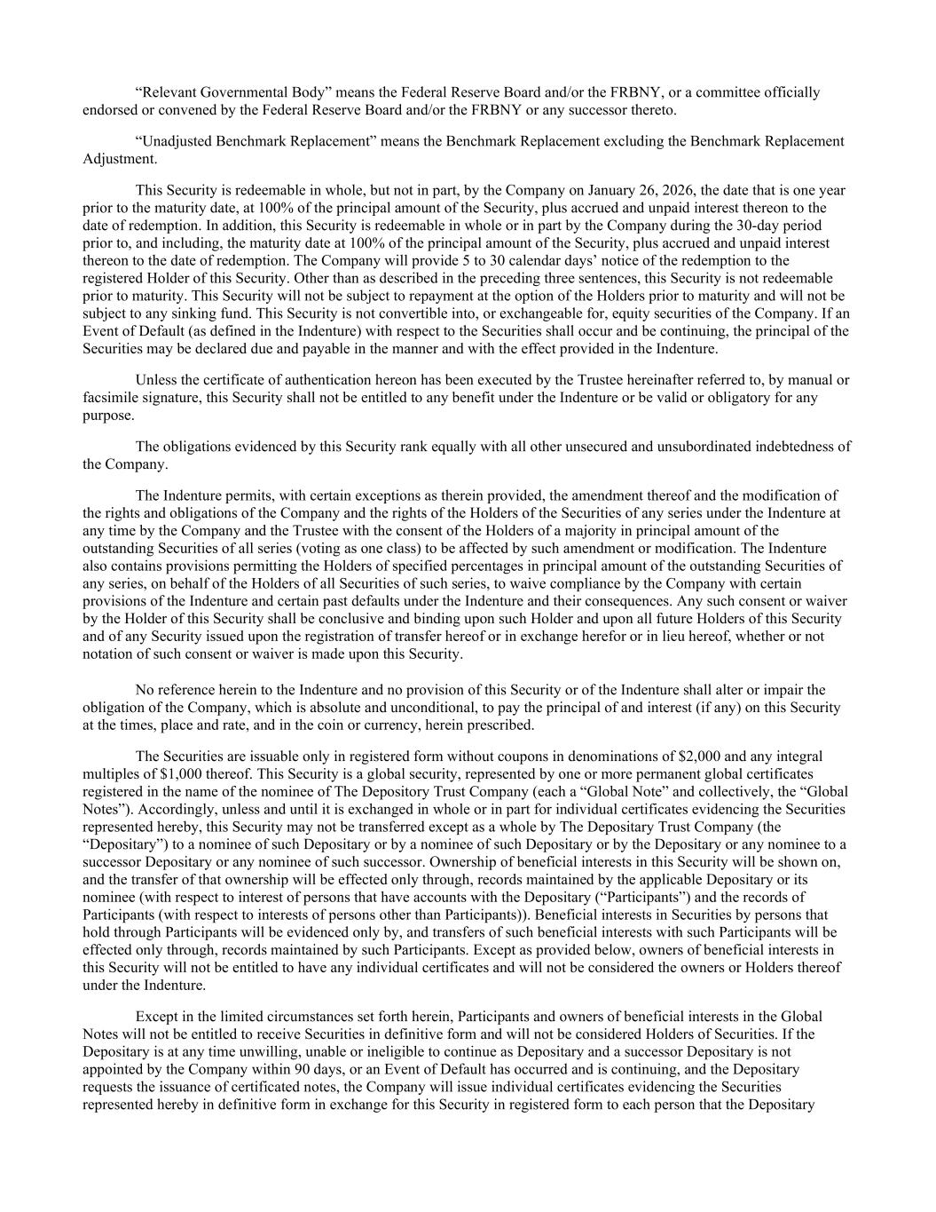 “Relevant Governmental Body” means the Federal Reserve Board and/or the FRBNY, or a committee officially endorsed or convened by the Federal Reserve Board and/or the FRBNY or any successor thereto. “Unadjusted Benchmark Replacement” means the Benchmark Replacement excluding the Benchmark Replacement Adjustment. This Security is redeemable in whole, but not in part, by the Company on January 26, 2026, the date that is one year prior to the maturity date, at 100% of the principal amount of the Security, plus accrued and unpaid interest thereon to the date of redemption. In addition, this Security is redeemable in whole or in part by the Company during the 30-day period prior to, and including, the maturity date at 100% of the principal amount of the Security, plus accrued and unpaid interest thereon to the date of redemption. The Company will provide 5 to 30 calendar days’ notice of the redemption to the registered Holder of this Security. Other than as described in the preceding three sentences, this Security is not redeemable prior to maturity. This Security will not be subject to repayment at the option of the Holders prior to maturity and will not be subject to any sinking fund. This Security is not convertible into, or exchangeable for, equity securities of the Company. If an Event of Default (as defined in the Indenture) with respect to the Securities shall occur and be continuing, the principal of the Securities may be declared due and payable in the manner and with the effect provided in the Indenture. Unless the certificate of authentication hereon has been executed by the Trustee hereinafter referred to, by manual or facsimile signature, this Security shall not be entitled to any benefit under the Indenture or be valid or obligatory for any purpose. The obligations evidenced by this Security rank equally with all other unsecured and unsubordinated indebtedness of the Company. The Indenture permits, with certain exceptions as therein provided, the amendment thereof and the modification of the rights and obligations of the Company and the rights of the Holders of the Securities of any series under the Indenture at any time by the Company and the Trustee with the consent of the Holders of a majority in principal amount of the outstanding Securities of all series (voting as one class) to be affected by such amendment or modification. The Indenture also contains provisions permitting the Holders of specified percentages in principal amount of the outstanding Securities of any series, on behalf of the Holders of all Securities of such series, to waive compliance by the Company with certain provisions of the Indenture and certain past defaults under the Indenture and their consequences. Any such consent or waiver by the Holder of this Security shall be conclusive and binding upon such Holder and upon all future Holders of this Security and of any Security issued upon the registration of transfer hereof or in exchange herefor or in lieu hereof, whether or not notation of such consent or waiver is made upon this Security. No reference herein to the Indenture and no provision of this Security or of the Indenture shall alter or impair the obligation of the Company, which is absolute and unconditional, to pay the principal of and interest (if any) on this Security at the times, place and rate, and in the coin or currency, herein prescribed. The Securities are issuable only in registered form without coupons in denominations of $2,000 and any integral multiples of $1,000 thereof. This Security is a global security, represented by one or more permanent global certificates registered in the name of the nominee of The Depository Trust Company (each a “Global Note” and collectively, the “Global Notes”). Accordingly, unless and until it is exchanged in whole or in part for individual certificates evidencing the Securities represented hereby, this Security may not be transferred except as a whole by The Depositary Trust Company (the “Depositary”) to a nominee of such Depositary or by a nominee of such Depositary or by the Depositary or any nominee to a successor Depositary or any nominee of such successor. Ownership of beneficial interests in this Security will be shown on, and the transfer of that ownership will be effected only through, records maintained by the applicable Depositary or its nominee (with respect to interest of persons that have accounts with the Depositary (“Participants”) and the records of Participants (with respect to interests of persons other than Participants)). Beneficial interests in Securities by persons that hold through Participants will be evidenced only by, and transfers of such beneficial interests with such Participants will be effected only through, records maintained by such Participants. Except as provided below, owners of beneficial interests in this Security will not be entitled to have any individual certificates and will not be considered the owners or Holders thereof under the Indenture. Except in the limited circumstances set forth herein, Participants and owners of beneficial interests in the Global Notes will not be entitled to receive Securities in definitive form and will not be considered Holders of Securities. If the Depositary is at any time unwilling, unable or ineligible to continue as Depositary and a successor Depositary is not appointed by the Company within 90 days, or an Event of Default has occurred and is continuing, and the Depositary requests the issuance of certificated notes, the Company will issue individual certificates evidencing the Securities represented hereby in definitive form in exchange for this Security in registered form to each person that the Depositary