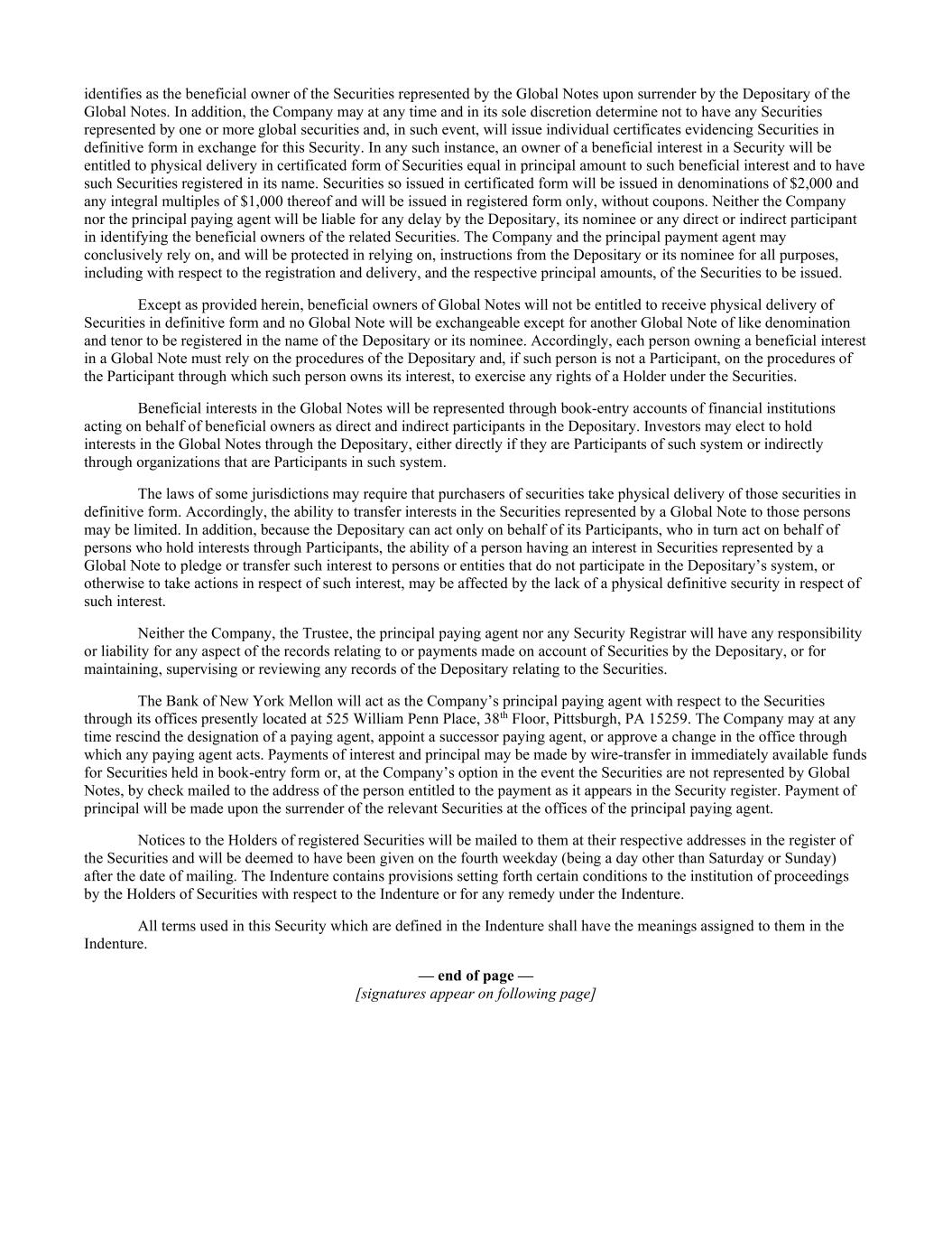 identifies as the beneficial owner of the Securities represented by the Global Notes upon surrender by the Depositary of the Global Notes. In addition, the Company may at any time and in its sole discretion determine not to have any Securities represented by one or more global securities and, in such event, will issue individual certificates evidencing Securities in definitive form in exchange for this Security. In any such instance, an owner of a beneficial interest in a Security will be entitled to physical delivery in certificated form of Securities equal in principal amount to such beneficial interest and to have such Securities registered in its name. Securities so issued in certificated form will be issued in denominations of $2,000 and any integral multiples of $1,000 thereof and will be issued in registered form only, without coupons. Neither the Company nor the principal paying agent will be liable for any delay by the Depositary, its nominee or any direct or indirect participant in identifying the beneficial owners of the related Securities. The Company and the principal payment agent may conclusively rely on, and will be protected in relying on, instructions from the Depositary or its nominee for all purposes, including with respect to the registration and delivery, and the respective principal amounts, of the Securities to be issued. Except as provided herein, beneficial owners of Global Notes will not be entitled to receive physical delivery of Securities in definitive form and no Global Note will be exchangeable except for another Global Note of like denomination and tenor to be registered in the name of the Depositary or its nominee. Accordingly, each person owning a beneficial interest in a Global Note must rely on the procedures of the Depositary and, if such person is not a Participant, on the procedures of the Participant through which such person owns its interest, to exercise any rights of a Holder under the Securities. Beneficial interests in the Global Notes will be represented through book-entry accounts of financial institutions acting on behalf of beneficial owners as direct and indirect participants in the Depositary. Investors may elect to hold interests in the Global Notes through the Depositary, either directly if they are Participants of such system or indirectly through organizations that are Participants in such system. The laws of some jurisdictions may require that purchasers of securities take physical delivery of those securities in definitive form. Accordingly, the ability to transfer interests in the Securities represented by a Global Note to those persons may be limited. In addition, because the Depositary can act only on behalf of its Participants, who in turn act on behalf of persons who hold interests through Participants, the ability of a person having an interest in Securities represented by a Global Note to pledge or transfer such interest to persons or entities that do not participate in the Depositary’s system, or otherwise to take actions in respect of such interest, may be affected by the lack of a physical definitive security in respect of such interest. Neither the Company, the Trustee, the principal paying agent nor any Security Registrar will have any responsibility or liability for any aspect of the records relating to or payments made on account of Securities by the Depositary, or for maintaining, supervising or reviewing any records of the Depositary relating to the Securities. The Bank of New York Mellon will act as the Company’s principal paying agent with respect to the Securities through its offices presently located at 525 William Penn Place, 38th Floor, Pittsburgh, PA 15259. The Company may at any time rescind the designation of a paying agent, appoint a successor paying agent, or approve a change in the office through which any paying agent acts. Payments of interest and principal may be made by wire-transfer in immediately available funds for Securities held in book-entry form or, at the Company’s option in the event the Securities are not represented by Global Notes, by check mailed to the address of the person entitled to the payment as it appears in the Security register. Payment of principal will be made upon the surrender of the relevant Securities at the offices of the principal paying agent. Notices to the Holders of registered Securities will be mailed to them at their respective addresses in the register of the Securities and will be deemed to have been given on the fourth weekday (being a day other than Saturday or Sunday) after the date of mailing. The Indenture contains provisions setting forth certain conditions to the institution of proceedings by the Holders of Securities with respect to the Indenture or for any remedy under the Indenture. All terms used in this Security which are defined in the Indenture shall have the meanings assigned to them in the Indenture. — end of page — [signatures appear on following page]