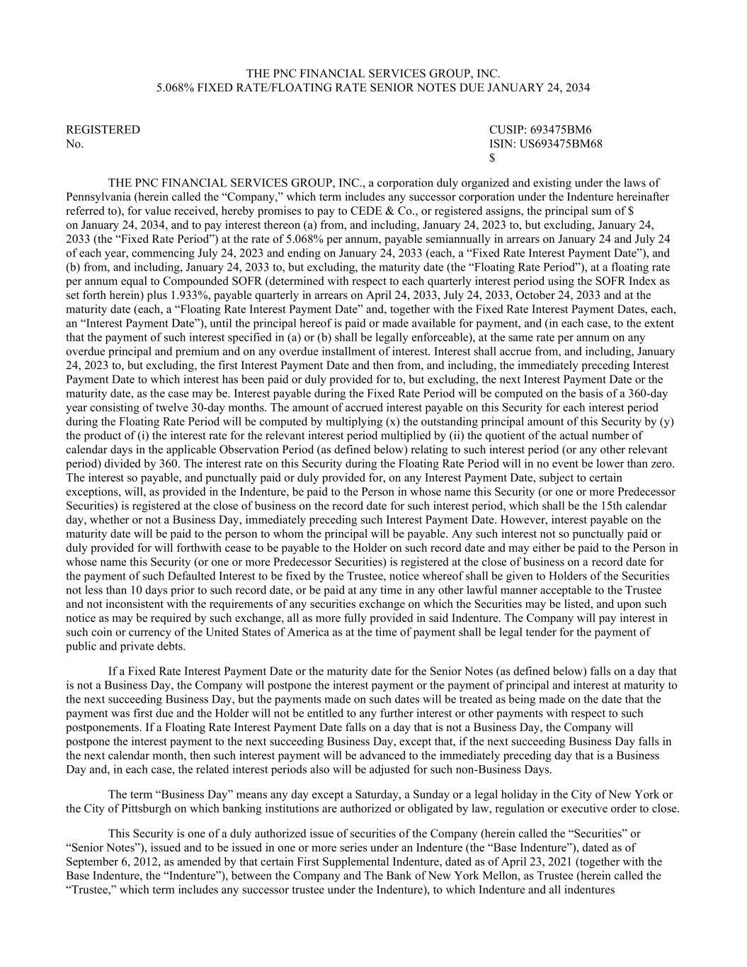 THE PNC FINANCIAL SERVICES GROUP, INC. 5.068% FIXED RATE/FLOATING RATE SENIOR NOTES DUE JANUARY 24, 2034 REGISTERED CUSIP: 693475BM6 No. ISIN: US693475BM68 $ THE PNC FINANCIAL SERVICES GROUP, INC., a corporation duly organized and existing under the laws of Pennsylvania (herein called the “Company,” which term includes any successor corporation under the Indenture hereinafter referred to), for value received, hereby promises to pay to CEDE & Co., or registered assigns, the principal sum of $ on January 24, 2034, and to pay interest thereon (a) from, and including, January 24, 2023 to, but excluding, January 24, 2033 (the “Fixed Rate Period”) at the rate of 5.068% per annum, payable semiannually in arrears on January 24 and July 24 of each year, commencing July 24, 2023 and ending on January 24, 2033 (each, a “Fixed Rate Interest Payment Date”), and (b) from, and including, January 24, 2033 to, but excluding, the maturity date (the “Floating Rate Period”), at a floating rate per annum equal to Compounded SOFR (determined with respect to each quarterly interest period using the SOFR Index as set forth herein) plus 1.933%, payable quarterly in arrears on April 24, 2033, July 24, 2033, October 24, 2033 and at the maturity date (each, a “Floating Rate Interest Payment Date” and, together with the Fixed Rate Interest Payment Dates, each, an “Interest Payment Date”), until the principal hereof is paid or made available for payment, and (in each case, to the extent that the payment of such interest specified in (a) or (b) shall be legally enforceable), at the same rate per annum on any overdue principal and premium and on any overdue installment of interest. Interest shall accrue from, and including, January 24, 2023 to, but excluding, the first Interest Payment Date and then from, and including, the immediately preceding Interest Payment Date to which interest has been paid or duly provided for to, but excluding, the next Interest Payment Date or the maturity date, as the case may be. Interest payable during the Fixed Rate Period will be computed on the basis of a 360-day year consisting of twelve 30-day months. The amount of accrued interest payable on this Security for each interest period during the Floating Rate Period will be computed by multiplying (x) the outstanding principal amount of this Security by (y) the product of (i) the interest rate for the relevant interest period multiplied by (ii) the quotient of the actual number of calendar days in the applicable Observation Period (as defined below) relating to such interest period (or any other relevant period) divided by 360. The interest rate on this Security during the Floating Rate Period will in no event be lower than zero. The interest so payable, and punctually paid or duly provided for, on any Interest Payment Date, subject to certain exceptions, will, as provided in the Indenture, be paid to the Person in whose name this Security (or one or more Predecessor Securities) is registered at the close of business on the record date for such interest period, which shall be the 15th calendar day, whether or not a Business Day, immediately preceding such Interest Payment Date. However, interest payable on the maturity date will be paid to the person to whom the principal will be payable. Any such interest not so punctually paid or duly provided for will forthwith cease to be payable to the Holder on such record date and may either be paid to the Person in whose name this Security (or one or more Predecessor Securities) is registered at the close of business on a record date for the payment of such Defaulted Interest to be fixed by the Trustee, notice whereof shall be given to Holders of the Securities not less than 10 days prior to such record date, or be paid at any time in any other lawful manner acceptable to the Trustee and not inconsistent with the requirements of any securities exchange on which the Securities may be listed, and upon such notice as may be required by such exchange, all as more fully provided in said Indenture. The Company will pay interest in such coin or currency of the United States of America as at the time of payment shall be legal tender for the payment of public and private debts. If a Fixed Rate Interest Payment Date or the maturity date for the Senior Notes (as defined below) falls on a day that is not a Business Day, the Company will postpone the interest payment or the payment of principal and interest at maturity to the next succeeding Business Day, but the payments made on such dates will be treated as being made on the date that the payment was first due and the Holder will not be entitled to any further interest or other payments with respect to such postponements. If a Floating Rate Interest Payment Date falls on a day that is not a Business Day, the Company will postpone the interest payment to the next succeeding Business Day, except that, if the next succeeding Business Day falls in the next calendar month, then such interest payment will be advanced to the immediately preceding day that is a Business Day and, in each case, the related interest periods also will be adjusted for such non-Business Days. The term “Business Day” means any day except a Saturday, a Sunday or a legal holiday in the City of New York or the City of Pittsburgh on which banking institutions are authorized or obligated by law, regulation or executive order to close. This Security is one of a duly authorized issue of securities of the Company (herein called the “Securities” or “Senior Notes”), issued and to be issued in one or more series under an Indenture (the “Base Indenture”), dated as of September 6, 2012, as amended by that certain First Supplemental Indenture, dated as of April 23, 2021 (together with the Base Indenture, the “Indenture”), between the Company and The Bank of New York Mellon, as Trustee (herein called the “Trustee,” which term includes any successor trustee