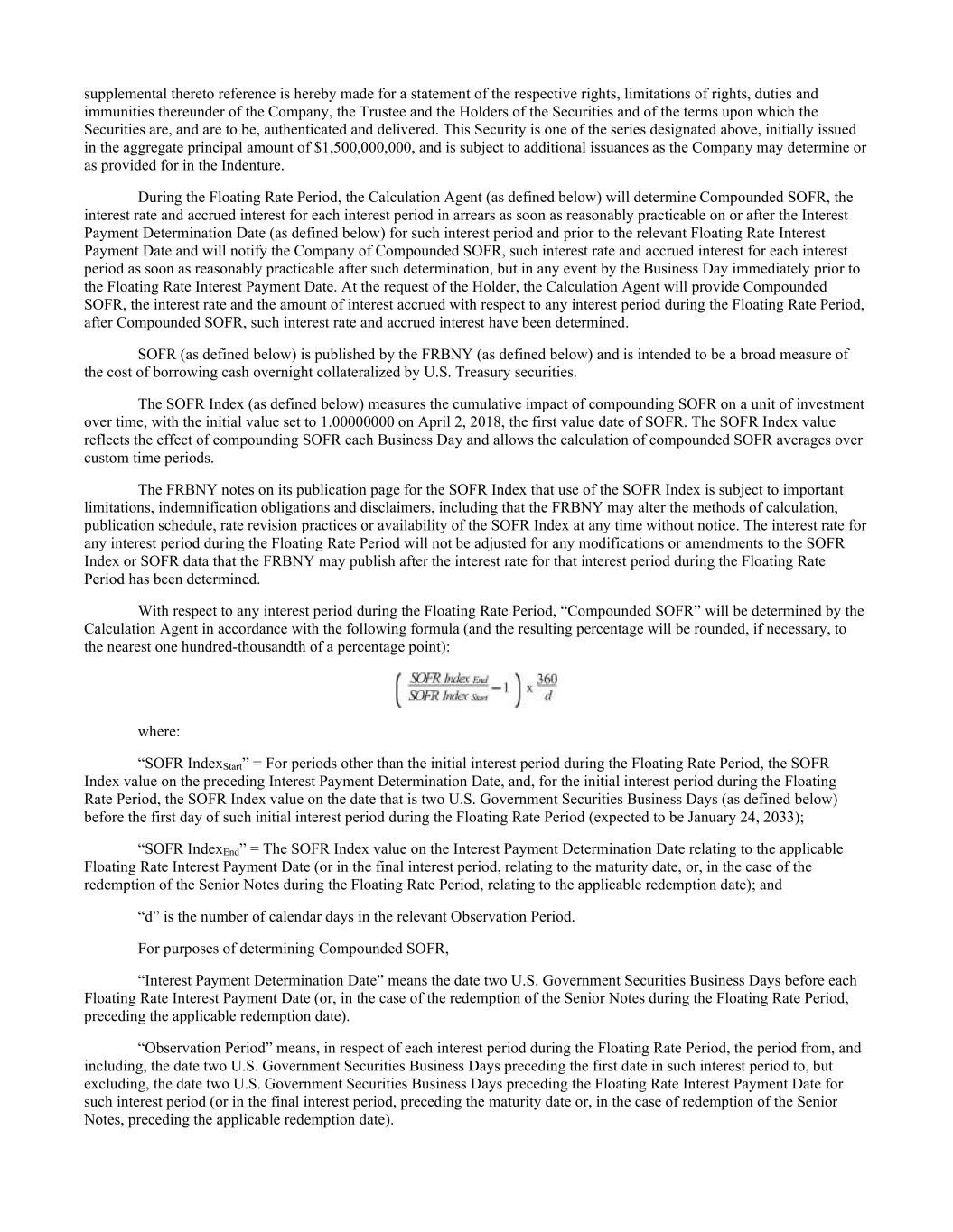 supplemental thereto reference is hereby made for a statement of the respective rights, limitations of rights, duties and immunities thereunder of the Company, the Trustee and the Holders of the Securities and of the terms upon which the Securities are, and are to be, authenticated and delivered. This Security is one of the series designated above, initially issued in the aggregate principal amount of $1,500,000,000, and is subject to additional issuances as the Company may determine or as provided for in the Indenture. During the Floating Rate Period, the Calculation Agent (as defined below) will determine Compounded SOFR, the interest rate and accrued interest for each interest period in arrears as soon as reasonably practicable on or after the Interest Payment Determination Date (as defined below) for such interest period and prior to the relevant Floating Rate Interest Payment Date and will notify the Company of Compounded SOFR, such interest rate and accrued interest for each interest period as soon as reasonably practicable after such determination, but in any event by the Business Day immediately prior to the Floating Rate Interest Payment Date. At the request of the Holder, the Calculation Agent will provide Compounded SOFR, the interest rate and the amount of interest accrued with respect to any interest period during the Floating Rate Period, after Compounded SOFR, such interest rate and accrued interest have been determined. SOFR (as defined below) is published by the FRBNY (as defined below) and is intended to be a broad measure of the cost of borrowing cash overnight collateralized by U.S. Treasury securities. The SOFR Index (as defined below) measures the cumulative impact of compounding SOFR on a unit of investment over time, with the initial value set to 1.00000000 on April 2, 2018, the first value date of SOFR. The SOFR Index value reflects the effect of compounding SOFR each Business Day and allows the calculation of compounded SOFR averages over custom time periods. The FRBNY notes on its publication page for the SOFR Index that use of the SOFR Index is subject to important limitations, indemnification obligations and disclaimers, including that the FRBNY may alter the methods of calculation, publication schedule, rate revision practices or availability of the SOFR Index at any time without notice. The interest rate for any interest period during the Floating Rate Period will not be adjusted for any modifications or amendments to the SOFR Index or SOFR data that the FRBNY may publish after the interest rate for that interest period during the Floating Rate Period has been determined. With respect to any interest period during the Floating Rate Period, “Compounded SOFR” will be determined by the Calculation Agent in accordance with the following formula (and the resulting percentage will be rounded, if necessary, to the nearest one hundred-thousandth of a percentage point): where: “SOFR IndexStart” = For periods other than the initial interest period during the Floating Rate Period, the SOFR Index value on the preceding Interest Payment Determination Date, and, for the initial interest period during the Floating Rate Period, the SOFR Index value on the date that is two U.S. Government Securities Business Days (as defined below) before the first day of such initial interest period during the Floating Rate Period (expected to be January 24, 2033); “SOFR IndexEnd” = The SOFR Index value on the Interest Payment Determination Date relating to the applicable Floating Rate Interest Payment Date (or in the final interest period, relating to the maturity date, or, in the case of the redemption of the Senior Notes during the Floating Rate Period, relating to the applicable redemption date); and “d” is the number of calendar days in the relevant Observation Period. For purposes of determining Compounded SOFR, “Interest Payment Determination Date” means the date two U.S. Government Securities Business Days before each Floating Rate Interest Payment Date (or, in the case of the redemption of the Senior Notes during the Floating Rate Period, preceding the applicable redemption date). “Observation Period” means, in respect of each interest period during the Floating Rate Period, the period from, and including, the date two U.S. Government Securities Business Days preceding the first date in such interest period to, but excluding, the date two U.S. Government Securities Business Days preceding the Floating Rate Interest Payment Date for such interest period (or in the final interest period, preceding the maturity date or, in the case of redemption of the Senior Notes, preceding the applicable redemption date).