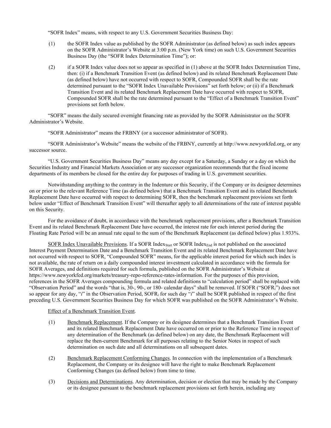 “SOFR Index” means, with respect to any U.S. Government Securities Business Day: (1) the SOFR Index value as published by the SOFR Administrator (as defined below) as such index appears on the SOFR Administrator’s Website at 3:00 p.m. (New York time) on such U.S. Government Securities Business Day (the “SOFR Index Determination Time”); or: (2) if a SOFR Index value does not so appear as specified in (1) above at the SOFR Index Determination Time, then: (i) if a Benchmark Transition Event (as defined below) and its related Benchmark Replacement Date (as defined below) have not occurred with respect to SOFR, Compounded SOFR shall be the rate determined pursuant to the “SOFR Index Unavailable Provisions” set forth below; or (ii) if a Benchmark Transition Event and its related Benchmark Replacement Date have occurred with respect to SOFR, Compounded SOFR shall be the rate determined pursuant to the “Effect of a Benchmark Transition Event” provisions set forth below. “SOFR” means the daily secured overnight financing rate as provided by the SOFR Administrator on the SOFR Administrator’s Website. “SOFR Administrator” means the FRBNY (or a successor administrator of SOFR). “SOFR Administrator’s Website” means the website of the FRBNY, currently at http://www.newyorkfed.org, or any successor source. “U.S. Government Securities Business Day” means any day except for a Saturday, a Sunday or a day on which the Securities Industry and Financial Markets Association or any successor organization recommends that the fixed income departments of its members be closed for the entire day for purposes of trading in U.S. government securities. Notwithstanding anything to the contrary in the Indenture or this Security, if the Company or its designee determines on or prior to the relevant Reference Time (as defined below) that a Benchmark Transition Event and its related Benchmark Replacement Date have occurred with respect to determining SOFR, then the benchmark replacement provisions set forth below under “Effect of Benchmark Transition Event” will thereafter apply to all determinations of the rate of interest payable on this Security. For the avoidance of doubt, in accordance with the benchmark replacement provisions, after a Benchmark Transition Event and its related Benchmark Replacement Date have occurred, the interest rate for each interest period during the Floating Rate Period will be an annual rate equal to the sum of the Benchmark Replacement (as defined below) plus 1.933%. SOFR Index Unavailable Provisions. If a SOFR IndexStart or SOFR IndexEnd is not published on the associated Interest Payment Determination Date and a Benchmark Transition Event and its related Benchmark Replacement Date have not occurred with respect to SOFR, “Compounded SOFR” means, for the applicable interest period for which such index is not available, the rate of return on a daily compounded interest investment calculated in accordance with the formula for SOFR Averages, and definitions required for such formula, published on the SOFR Administrator’s Website at https://www.newyorkfed.org/markets/treasury-repo-reference-rates-information. For the purposes of this provision, references in the SOFR Averages compounding formula and related definitions to “calculation period” shall be replaced with “Observation Period” and the words “that is, 30-, 90-, or 180- calendar days” shall be removed. If SOFR (“SOFRi”) does not so appear for any day, “i” in the Observation Period, SOFRi for such day “i” shall be SOFR published in respect of the first preceding U.S. Government Securities Business Day for which SOFR was published on the SOFR Administrator’s Website. Effect of a Benchmark Transition Event. (1) Benchmark Replacement. If the Company or its designee determines that a Benchmark Transition Event and its related Benchmark Replacement Date have occurred on or prior to the Reference Time in respect of any determination of the Benchmark (as defined below) on any date, the Benchmark Replacement will replace the then-current Benchmark for all purposes relating to the Senior Notes in respect of such determination on such date and all determinations on all subsequent dates. (2) Benchmark Replacement Conforming Changes. In connection with the implementation of a Benchmark Replacement, the Company or its designee will have the right to make Benchmark Replacement Conforming Changes (as defined below) from time to time. (3) Decisions and Determinations. Any determination, decision or election that may be made by the Company or its designee pursuant to the benchmark replacement provisions set forth herein, including any