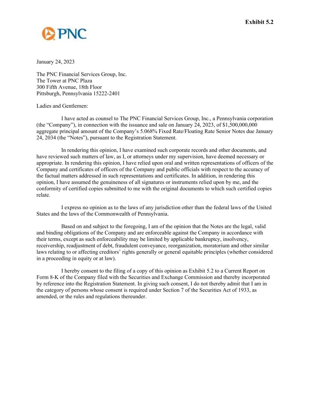 Exhibit 5.2 January 24, 2023 The PNC Financial Services Group, Inc. The Tower at PNC Plaza 300 Fifth Avenue, 18th Floor Pittsburgh, Pennsylvania 15222-2401 Ladies and Gentlemen: I have acted as counsel to The PNC Financial Services Group, Inc., a Pennsylvania corporation (the “Company”), in connection with the issuance and sale on January 24, 2023, of $1,500,000,000 aggregate principal amount of the Company’s 5.068% Fixed Rate/Floating Rate Senior Notes due January 24, 2034 (the “Notes”), pursuant to the Registration Statement. In rendering this opinion, I have examined such corporate records and other documents, and have reviewed such matters of law, as I, or attorneys under my supervision, have deemed necessary or appropriate. In rendering this opinion, I have relied upon oral and written representations of officers of the Company and certificates of officers of the Company and public officials with respect to the accuracy of the factual matters addressed in such representations and certificates. In addition, in rendering this opinion, I have assumed the genuineness of all signatures or instruments relied upon by me, and the conformity of certified copies submitted to me with the original documents to which such certified copies relate. I express no opinion as to the laws of any jurisdiction other than the federal laws of the United States and the laws of the Commonwealth of Pennsylvania. Based on and subject to the foregoing, I am of the opinion that the Notes are the legal, valid and binding obligations of the Company and are enforceable against the Company in accordance with their terms, except as such enforceability may be limited by applicable bankruptcy, insolvency, receivership, readjustment of debt, fraudulent conveyance, reorganization, moratorium and other similar laws relating to or affecting creditors’ rights generally or general equitable principles (whether considered in a proceeding in equity or at law). I hereby consent to the filing of a copy of this opinion as Exhibit 5.2 to a Current Report on Form 8-K of the Company filed with the Securities and Exchange Commission and thereby incorporated by reference into the Registration Statement. In giving such consent, I do not thereby admit that I am in the category of persons whose consent is required under Section 7 of the Securities Act of 1933, as amended, or the rules and regulations thereunder.