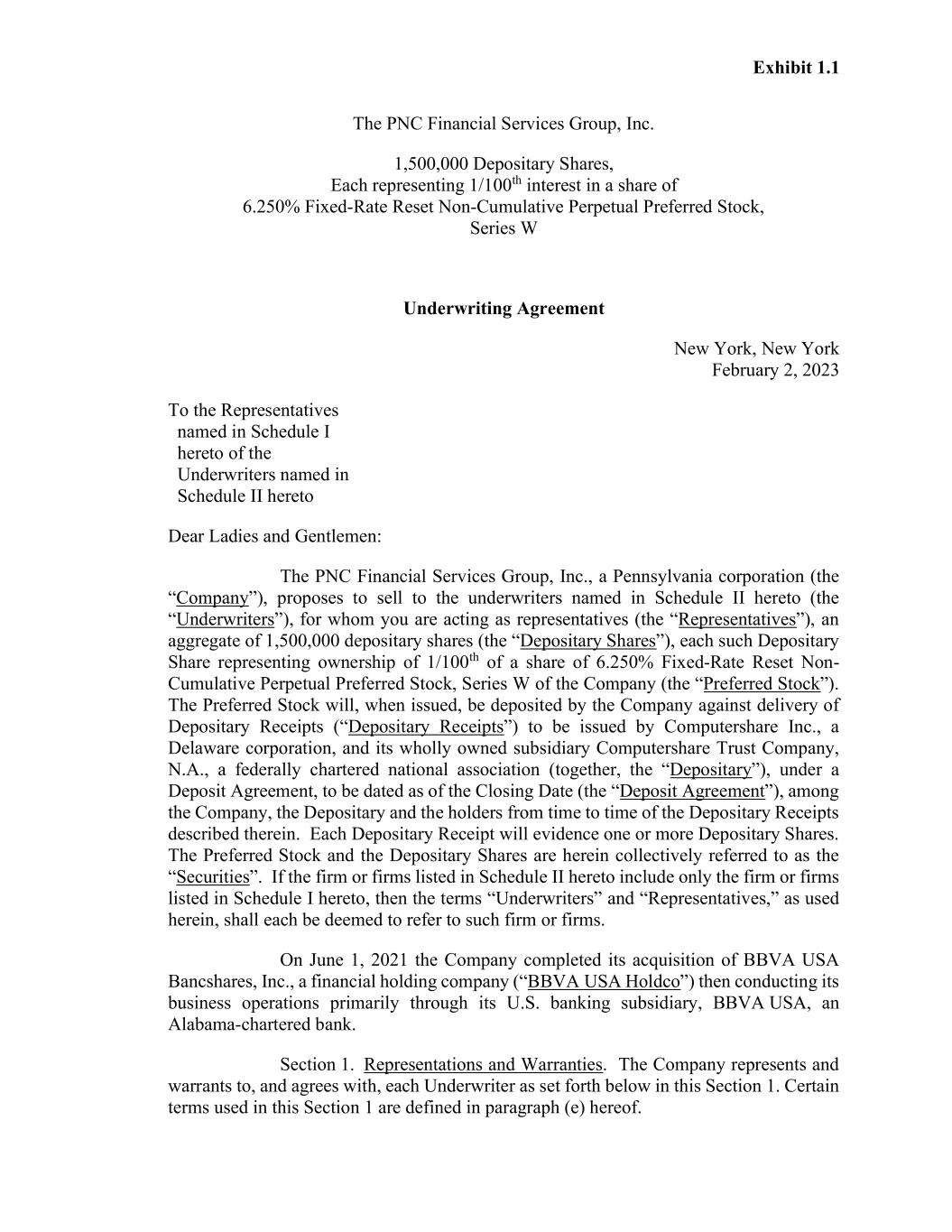 Exhibit 1.1 The PNC Financial Services Group, Inc. 1,500,000 Depositary Shares, Each representing 1/100th interest in a share of 6.250% Fixed-Rate Reset Non-Cumulative Perpetual Preferred Stock, Series W Underwriting Agreement New York, New York February 2, 2023 To the Representatives named in Schedule I hereto of the Underwriters named in Schedule II hereto Dear Ladies and Gentlemen: The PNC Financial Services Group, Inc., a Pennsylvania corporation (the “Company”), proposes to sell to the underwriters named in Schedule II hereto (the “Underwriters”), for whom you are acting as representatives (the “Representatives”), an aggregate of 1,500,000 depositary shares (the “Depositary Shares”), each such Depositary Share representing ownership of 1/100th of a share of 6.250% Fixed-Rate Reset Non- Cumulative Perpetual Preferred Stock, Series W of the Company (the “Preferred Stock”). The Preferred Stock will, when issued, be deposited by the Company against delivery of Depositary Receipts (“Depositary Receipts”) to be issued by Computershare Inc., a Delaware corporation, and its wholly owned subsidiary Computershare Trust Company, N.A., a federally chartered national association (together, the “Depositary”), under a Deposit Agreement, to be dated as of the Closing Date (the “Deposit Agreement”), among the Company, the Depositary and the holders from time to time of the Depositary Receipts described therein. Each Depositary Receipt will evidence one or more Depositary Shares. The Preferred Stock and the Depositary Shares are herein collectively referred to as the “Securities”. If the firm or firms listed in Schedule II hereto include only the firm or firms listed in Schedule I hereto, then the terms “Underwriters” and “Representatives,” as used herein, shall each be deemed to refer to such firm or firms. On June 1, 2021 the Company completed its acquisition of BBVA USA Bancshares, Inc., a financial holding company (“BBVA USA Holdco”) then conducting its business operations primarily through its U.S. banking subsidiary, BBVA USA, an Alabama-chartered bank. Section 1. Representations and Warranties. The Company represents and warrants to, and agrees with, each Underwriter as set forth below in this Section 1. Certain terms used in this Section 1 are defined in paragraph (e) hereof.