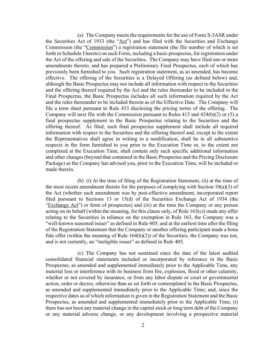 2 (a) The Company meets the requirements for the use of Form S-3ASR under the Securities Act of 1933 (the “Act”) and has filed with the Securities and Exchange Commission (the “Commission”) a registration statement (the file number of which is set forth in Schedule I hereto) on such Form, including a basic prospectus, for registration under the Act of the offering and sale of the Securities. The Company may have filed one or more amendments thereto, and has prepared a Preliminary Final Prospectus, each of which has previously been furnished to you. Such registration statement, as so amended, has become effective. The offering of the Securities is a Delayed Offering (as defined below) and, although the Basic Prospectus may not include all information with respect to the Securities and the offering thereof required by the Act and the rules thereunder to be included in the Final Prospectus, the Basic Prospectus includes all such information required by the Act and the rules thereunder to be included therein as of the Effective Date. The Company will file a term sheet pursuant to Rule 433 disclosing the pricing terms of the offering. The Company will next file with the Commission pursuant to Rules 415 and 424(b)(2) or (5) a final prospectus supplement to the Basic Prospectus relating to the Securities and the offering thereof. As filed, such final prospectus supplement shall include all required information with respect to the Securities and the offering thereof and, except to the extent the Representatives shall agree in writing to a modification, shall be in all substantive respects in the form furnished to you prior to the Execution Time or, to the extent not completed at the Execution Time, shall contain only such specific additional information and other changes (beyond that contained in the Basic Prospectus and the Pricing Disclosure Package) as the Company has advised you, prior to the Execution Time, will be included or made therein. (b) (i) At the time of filing of the Registration Statement, (ii) at the time of the most recent amendment thereto for the purposes of complying with Section 10(a)(3) of the Act (whether such amendment was by post-effective amendment, incorporated report filed pursuant to Sections 13 or 15(d) of the Securities Exchange Act of 1934 (the “Exchange Act”) or form of prospectus) and (iii) at the time the Company or any person acting on its behalf (within the meaning, for this clause only, of Rule 163(c)) made any offer relating to the Securities in reliance on the exemption in Rule 163, the Company was a “well-known seasoned issuer” as defined in Rule 405; and at the earliest time after the filing of the Registration Statement that the Company or another offering participant made a bona fide offer (within the meaning of Rule 164(h)(2)) of the Securities, the Company was not, and is not currently, an “ineligible issuer” as defined in Rule 405. (c) The Company has not sustained since the date of the latest audited consolidated financial statements included or incorporated by reference in the Basic Prospectus, as amended and supplemented immediately prior to the Applicable Time, any material loss or interference with its business from fire, explosion, flood or other calamity, whether or not covered by insurance, or from any labor dispute or court or governmental action, order or decree, otherwise than as set forth or contemplated in the Basic Prospectus, as amended and supplemented immediately prior to the Applicable Time; and, since the respective dates as of which information is given in the Registration Statement and the Basic Prospectus, as amended and supplemented immediately prior to the Applicable Time, (i) there has not been any material change in the capital stock or long term debt of the Company or any material adverse change, or any development involving a prospective material
