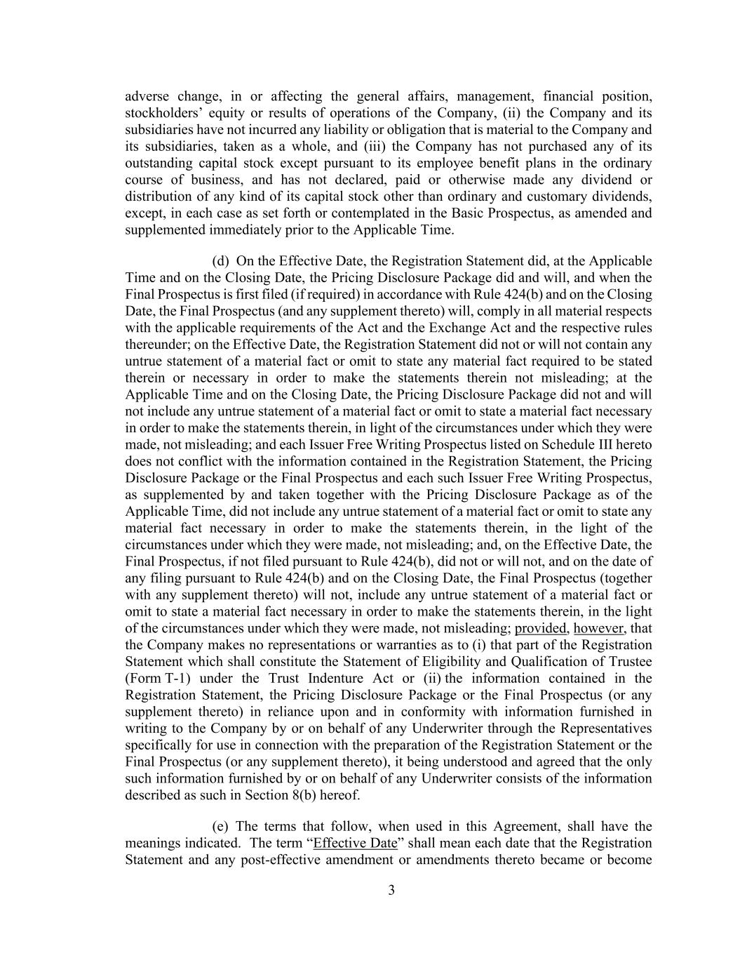 3 adverse change, in or affecting the general affairs, management, financial position, stockholders’ equity or results of operations of the Company, (ii) the Company and its subsidiaries have not incurred any liability or obligation that is material to the Company and its subsidiaries, taken as a whole, and (iii) the Company has not purchased any of its outstanding capital stock except pursuant to its employee benefit plans in the ordinary course of business, and has not declared, paid or otherwise made any dividend or distribution of any kind of its capital stock other than ordinary and customary dividends, except, in each case as set forth or contemplated in the Basic Prospectus, as amended and supplemented immediately prior to the Applicable Time. (d) On the Effective Date, the Registration Statement did, at the Applicable Time and on the Closing Date, the Pricing Disclosure Package did and will, and when the Final Prospectus is first filed (if required) in accordance with Rule 424(b) and on the Closing Date, the Final Prospectus (and any supplement thereto) will, comply in all material respects with the applicable requirements of the Act and the Exchange Act and the respective rules thereunder; on the Effective Date, the Registration Statement did not or will not contain any untrue statement of a material fact or omit to state any material fact required to be stated therein or necessary in order to make the statements therein not misleading; at the Applicable Time and on the Closing Date, the Pricing Disclosure Package did not and will not include any untrue statement of a material fact or omit to state a material fact necessary in order to make the statements therein, in light of the circumstances under which they were made, not misleading; and each Issuer Free Writing Prospectus listed on Schedule III hereto does not conflict with the information contained in the Registration Statement, the Pricing Disclosure Package or the Final Prospectus and each such Issuer Free Writing Prospectus, as supplemented by and taken together with the Pricing Disclosure Package as of the Applicable Time, did not include any untrue statement of a material fact or omit to state any material fact necessary in order to make the statements therein, in the light of the circumstances under which they were made, not misleading; and, on the Effective Date, the Final Prospectus, if not filed pursuant to Rule 424(b), did not or will not, and on the date of any filing pursuant to Rule 424(b) and on the Closing Date, the Final Prospectus (together with any supplement thereto) will not, include any untrue statement of a material fact or omit to state a material fact necessary in order to make the statements therein, in the light of the circumstances under which they were made, not misleading; provided, however, that the Company makes no representations or warranties as to (i) that part of the Registration Statement which shall constitute the Statement of Eligibility and Qualification of Trustee (Form T-1) under the Trust Indenture Act or (ii) the information contained in the Registration Statement, the Pricing Disclosure Package or the Final Prospectus (or any supplement thereto) in reliance upon and in conformity with information furnished in writing to the Company by or on behalf of any Underwriter through the Representatives specifically for use in connection with the preparation of the Registration Statement or the Final Prospectus (or any supplement thereto), it being understood and agreed that the only such information furnished by or on behalf of any Underwriter consists of the information described as such in Section 8(b) hereof. (e) The terms that follow, when used in this Agreement, shall have the meanings indicated. The term “Effective Date” shall mean each date that the Registration Statement and any post-effective amendment or amendments thereto became or become
