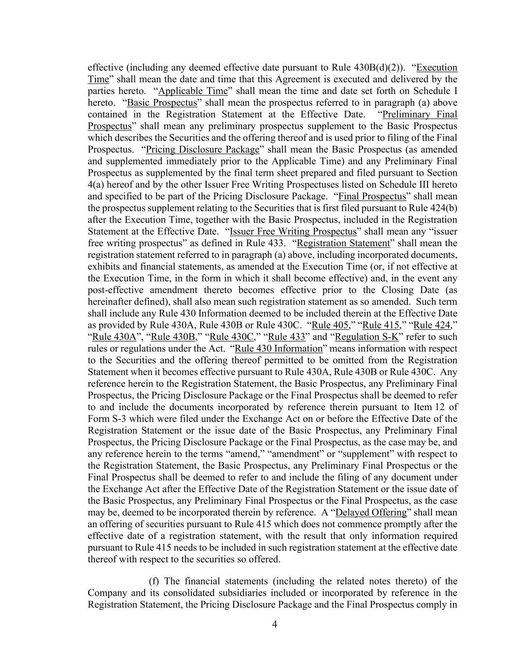 4 effective (including any deemed effective date pursuant to Rule 430B(d)(2)). “Execution Time” shall mean the date and time that this Agreement is executed and delivered by the parties hereto. “Applicable Time” shall mean the time and date set forth on Schedule I hereto. “Basic Prospectus” shall mean the prospectus referred to in paragraph (a) above contained in the Registration Statement at the Effective Date. “Preliminary Final Prospectus” shall mean any preliminary prospectus supplement to the Basic Prospectus which describes the Securities and the offering thereof and is used prior to filing of the Final Prospectus. “Pricing Disclosure Package” shall mean the Basic Prospectus (as amended and supplemented immediately prior to the Applicable Time) and any Preliminary Final Prospectus as supplemented by the final term sheet prepared and filed pursuant to Section 4(a) hereof and by the other Issuer Free Writing Prospectuses listed on Schedule III hereto and specified to be part of the Pricing Disclosure Package. “Final Prospectus” shall mean the prospectus supplement relating to the Securities that is first filed pursuant to Rule 424(b) after the Execution Time, together with the Basic Prospectus, included in the Registration Statement at the Effective Date. “Issuer Free Writing Prospectus” shall mean any “issuer free writing prospectus” as defined in Rule 433. “Registration Statement” shall mean the registration statement referred to in paragraph (a) above, including incorporated documents, exhibits and financial statements, as amended at the Execution Time (or, if not effective at the Execution Time, in the form in which it shall become effective) and, in the event any post-effective amendment thereto becomes effective prior to the Closing Date (as hereinafter defined), shall also mean such registration statement as so amended. Such term shall include any Rule 430 Information deemed to be included therein at the Effective Date as provided by Rule 430A, Rule 430B or Rule 430C. “Rule 405,” “Rule 415,” “Rule 424,” “Rule 430A”, “Rule 430B,” “Rule 430C,” “Rule 433” and “Regulation S-K” refer to such rules or regulations under the Act. “Rule 430 Information” means information with respect to the Securities and the offering thereof permitted to be omitted from the Registration Statement when it becomes effective pursuant to Rule 430A, Rule 430B or Rule 430C. Any reference herein to the Registration Statement, the Basic Prospectus, any Preliminary Final Prospectus, the Pricing Disclosure Package or the Final Prospectus shall be deemed to refer to and include the documents incorporated by reference therein pursuant to Item 12 of Form S-3 which were filed under the Exchange Act on or before the Effective Date of the Registration Statement or the issue date of the Basic Prospectus, any Preliminary Final Prospectus, the Pricing Disclosure Package or the Final Prospectus, as the case may be, and any reference herein to the terms “amend,” “amendment” or “supplement” with respect to the Registration Statement, the Basic Prospectus, any Preliminary Final Prospectus or the Final Prospectus shall be deemed to refer to and include the filing of any document under the Exchange Act after the Effective Date of the Registration Statement or the issue date of the Basic Prospectus, any Preliminary Final Prospectus or the Final Prospectus, as the case may be, deemed to be incorporated therein by reference. A “Delayed Offering” shall mean an offering of securities pursuant to Rule 415 which does not commence promptly after the effective date of a registration statement, with the result that only information required pursuant to Rule 415 needs to be included in such registration statement at the effective date thereof with respect to the securities so offered. (f) The financial statements (including the related notes thereto) of the Company and its consolidated subsidiaries included or incorporated by reference in the Registration Statement, the Pricing Disclosure Package and the Final Prospectus comply in