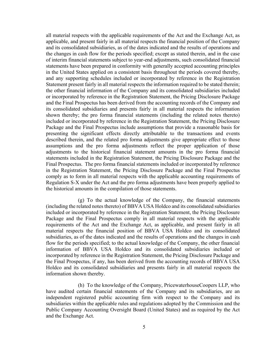 5 all material respects with the applicable requirements of the Act and the Exchange Act, as applicable, and present fairly in all material respects the financial position of the Company and its consolidated subsidiaries, as of the dates indicated and the results of operations and the changes in cash flow for the periods specified; except as stated therein, and in the case of interim financial statements subject to year-end adjustments, such consolidated financial statements have been prepared in conformity with generally accepted accounting principles in the United States applied on a consistent basis throughout the periods covered thereby, and any supporting schedules included or incorporated by reference in the Registration Statement present fairly in all material respects the information required to be stated therein; the other financial information of the Company and its consolidated subsidiaries included or incorporated by reference in the Registration Statement, the Pricing Disclosure Package and the Final Prospectus has been derived from the accounting records of the Company and its consolidated subsidiaries and presents fairly in all material respects the information shown thereby; the pro forma financial statements (including the related notes thereto) included or incorporated by reference in the Registration Statement, the Pricing Disclosure Package and the Final Prospectus include assumptions that provide a reasonable basis for presenting the significant effects directly attributable to the transactions and events described therein, and the related pro forma adjustments give appropriate effect to those assumptions and the pro forma adjustments reflect the proper application of those adjustments to the historical financial statement amounts in the pro forma financial statements included in the Registration Statement, the Pricing Disclosure Package and the Final Prospectus. The pro forma financial statements included or incorporated by reference in the Registration Statement, the Pricing Disclosure Package and the Final Prospectus comply as to form in all material respects with the applicable accounting requirements of Regulation S-X under the Act and the pro forma adjustments have been properly applied to the historical amounts in the compilation of those statements. (g) To the actual knowledge of the Company, the financial statements (including the related notes thereto) of BBVA USA Holdco and its consolidated subsidiaries included or incorporated by reference in the Registration Statement, the Pricing Disclosure Package and the Final Prospectus comply in all material respects with the applicable requirements of the Act and the Exchange Act, as applicable, and present fairly in all material respects the financial position of BBVA USA Holdco and its consolidated subsidiaries, as of the dates indicated and the results of operations and the changes in cash flow for the periods specified; to the actual knowledge of the Company, the other financial information of BBVA USA Holdco and its consolidated subsidiaries included or incorporated by reference in the Registration Statement, the Pricing Disclosure Package and the Final Prospectus, if any, has been derived from the accounting records of BBVA USA Holdco and its consolidated subsidiaries and presents fairly in all material respects the information shown thereby. (h) To the knowledge of the Company, PricewaterhouseCoopers LLP, who have audited certain financial statements of the Company and its subsidiaries, are an independent registered public accounting firm with respect to the Company and its subsidiaries within the applicable rules and regulations adopted by the Commission and the Public Company Accounting Oversight Board (United States) and as required by the Act and the Exchange Act.