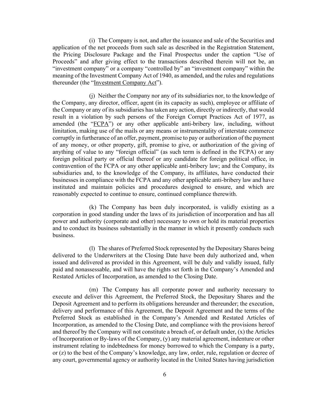 6 (i) The Company is not, and after the issuance and sale of the Securities and application of the net proceeds from such sale as described in the Registration Statement, the Pricing Disclosure Package and the Final Prospectus under the caption “Use of Proceeds” and after giving effect to the transactions described therein will not be, an “investment company” or a company “controlled by” an “investment company” within the meaning of the Investment Company Act of 1940, as amended, and the rules and regulations thereunder (the “Investment Company Act”). (j) Neither the Company nor any of its subsidiaries nor, to the knowledge of the Company, any director, officer, agent (in its capacity as such), employee or affiliate of the Company or any of its subsidiaries has taken any action, directly or indirectly, that would result in a violation by such persons of the Foreign Corrupt Practices Act of 1977, as amended (the “FCPA”) or any other applicable anti-bribery law, including, without limitation, making use of the mails or any means or instrumentality of interstate commerce corruptly in furtherance of an offer, payment, promise to pay or authorization of the payment of any money, or other property, gift, promise to give, or authorization of the giving of anything of value to any “foreign official” (as such term is defined in the FCPA) or any foreign political party or official thereof or any candidate for foreign political office, in contravention of the FCPA or any other applicable anti-bribery law; and the Company, its subsidiaries and, to the knowledge of the Company, its affiliates, have conducted their businesses in compliance with the FCPA and any other applicable anti-bribery law and have instituted and maintain policies and procedures designed to ensure, and which are reasonably expected to continue to ensure, continued compliance therewith. (k) The Company has been duly incorporated, is validly existing as a corporation in good standing under the laws of its jurisdiction of incorporation and has all power and authority (corporate and other) necessary to own or hold its material properties and to conduct its business substantially in the manner in which it presently conducts such business. (l) The shares of Preferred Stock represented by the Depositary Shares being delivered to the Underwriters at the Closing Date have been duly authorized and, when issued and delivered as provided in this Agreement, will be duly and validly issued, fully paid and nonassessable, and will have the rights set forth in the Company’s Amended and Restated Articles of Incorporation, as amended to the Closing Date. (m) The Company has all corporate power and authority necessary to execute and deliver this Agreement, the Preferred Stock, the Depositary Shares and the Deposit Agreement and to perform its obligations hereunder and thereunder; the execution, delivery and performance of this Agreement, the Deposit Agreement and the terms of the Preferred Stock as established in the Company’s Amended and Restated Articles of Incorporation, as amended to the Closing Date, and compliance with the provisions hereof and thereof by the Company will not constitute a breach of, or default under, (x) the Articles of Incorporation or By-laws of the Company, (y) any material agreement, indenture or other instrument relating to indebtedness for money borrowed to which the Company is a party, or (z) to the best of the Company’s knowledge, any law, order, rule, regulation or decree of any court, governmental agency or authority located in the United States having jurisdiction