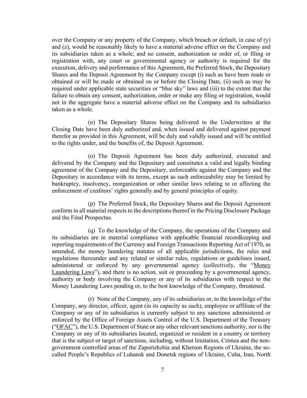 7 over the Company or any property of the Company, which breach or default, in case of (y) and (z), would be reasonably likely to have a material adverse effect on the Company and its subsidiaries taken as a whole; and no consent, authorization or order of, or filing or registration with, any court or governmental agency or authority is required for the execution, delivery and performance of this Agreement, the Preferred Stock, the Depositary Shares and the Deposit Agreement by the Company except (i) such as have been made or obtained or will be made or obtained on or before the Closing Date, (ii) such as may be required under applicable state securities or “blue sky” laws and (iii) to the extent that the failure to obtain any consent, authorization, order or make any filing or registration, would not in the aggregate have a material adverse effect on the Company and its subsidiaries taken as a whole. (n) The Depositary Shares being delivered to the Underwriters at the Closing Date have been duly authorized and, when issued and delivered against payment therefor as provided in this Agreement, will be duly and validly issued and will be entitled to the rights under, and the benefits of, the Deposit Agreement. (o) The Deposit Agreement has been duly authorized, executed and delivered by the Company and the Depositary and constitutes a valid and legally binding agreement of the Company and the Depositary, enforceable against the Company and the Depositary in accordance with its terms, except as such enforceability may be limited by bankruptcy, insolvency, reorganization or other similar laws relating to or affecting the enforcement of creditors’ rights generally and by general principles of equity. (p) The Preferred Stock, the Depositary Shares and the Deposit Agreement conform in all material respects to the descriptions thereof in the Pricing Disclosure Package and the Final Prospectus. (q) To the knowledge of the Company, the operations of the Company and its subsidiaries are in material compliance with applicable financial recordkeeping and reporting requirements of the Currency and Foreign Transactions Reporting Act of 1970, as amended, the money laundering statutes of all applicable jurisdictions, the rules and regulations thereunder and any related or similar rules, regulations or guidelines issued, administered or enforced by any governmental agency (collectively, the “Money Laundering Laws”), and there is no action, suit or proceeding by a governmental agency, authority or body involving the Company or any of its subsidiaries with respect to the Money Laundering Laws pending or, to the best knowledge of the Company, threatened. (r) None of the Company, any of its subsidiaries or, to the knowledge of the Company, any director, officer, agent (in its capacity as such), employee or affiliate of the Company or any of its subsidiaries is currently subject to any sanctions administered or enforced by the Office of Foreign Assets Control of the U.S. Department of the Treasury (“OFAC”), the U.S. Department of State or any other relevant sanctions authority, nor is the Company or any of its subsidiaries located, organized or resident in a country or territory that is the subject or target of sanctions, including, without limitation, Crimea and the non- government controlled areas of the Zaporizhzhia and Kherson Regions of Ukraine, the so- called People’s Republics of Luhansk and Donetsk regions of Ukraine, Cuba, Iran, North