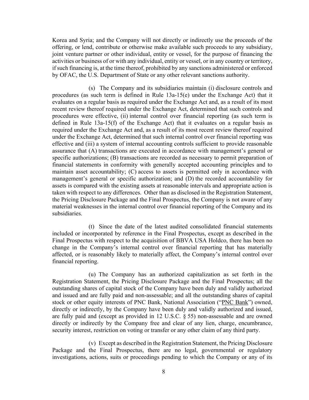 8 Korea and Syria; and the Company will not directly or indirectly use the proceeds of the offering, or lend, contribute or otherwise make available such proceeds to any subsidiary, joint venture partner or other individual, entity or vessel, for the purpose of financing the activities or business of or with any individual, entity or vessel, or in any country or territory, if such financing is, at the time thereof, prohibited by any sanctions administered or enforced by OFAC, the U.S. Department of State or any other relevant sanctions authority. (s) The Company and its subsidiaries maintain (i) disclosure controls and procedures (as such term is defined in Rule 13a-15(e) under the Exchange Act) that it evaluates on a regular basis as required under the Exchange Act and, as a result of its most recent review thereof required under the Exchange Act, determined that such controls and procedures were effective, (ii) internal control over financial reporting (as such term is defined in Rule 13a-15(f) of the Exchange Act) that it evaluates on a regular basis as required under the Exchange Act and, as a result of its most recent review thereof required under the Exchange Act, determined that such internal control over financial reporting was effective and (iii) a system of internal accounting controls sufficient to provide reasonable assurance that (A) transactions are executed in accordance with management’s general or specific authorizations; (B) transactions are recorded as necessary to permit preparation of financial statements in conformity with generally accepted accounting principles and to maintain asset accountability; (C) access to assets is permitted only in accordance with management’s general or specific authorization; and (D) the recorded accountability for assets is compared with the existing assets at reasonable intervals and appropriate action is taken with respect to any differences. Other than as disclosed in the Registration Statement, the Pricing Disclosure Package and the Final Prospectus, the Company is not aware of any material weaknesses in the internal control over financial reporting of the Company and its subsidiaries. (t) Since the date of the latest audited consolidated financial statements included or incorporated by reference in the Final Prospectus, except as described in the Final Prospectus with respect to the acquisition of BBVA USA Holdco, there has been no change in the Company’s internal control over financial reporting that has materially affected, or is reasonably likely to materially affect, the Company’s internal control over financial reporting. (u) The Company has an authorized capitalization as set forth in the Registration Statement, the Pricing Disclosure Package and the Final Prospectus; all the outstanding shares of capital stock of the Company have been duly and validly authorized and issued and are fully paid and non-assessable; and all the outstanding shares of capital stock or other equity interests of PNC Bank, National Association (“PNC Bank”) owned, directly or indirectly, by the Company have been duly and validly authorized and issued, are fully paid and (except as provided in 12 U.S.C. § 55) non-assessable and are owned directly or indirectly by the Company free and clear of any lien, charge, encumbrance, security interest, restriction on voting or transfer or any other claim of any third party. (v) Except as described in the Registration Statement, the Pricing Disclosure Package and the Final Prospectus, there are no legal, governmental or regulatory investigations, actions, suits or proceedings pending to which the Company or any of its
