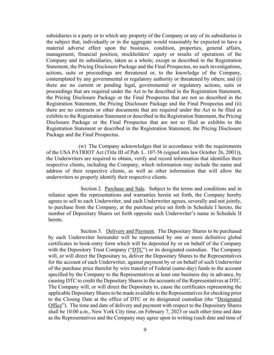 9 subsidiaries is a party or to which any property of the Company or any of its subsidiaries is the subject that, individually or in the aggregate would reasonably be expected to have a material adverse effect upon the business, condition, properties, general affairs, management, financial position, stockholders’ equity or results of operations of the Company and its subsidiaries, taken as a whole; except as described in the Registration Statement, the Pricing Disclosure Package and the Final Prospectus, no such investigations, actions, suits or proceedings are threatened or, to the knowledge of the Company, contemplated by any governmental or regulatory authority or threatened by others; and (i) there are no current or pending legal, governmental or regulatory actions, suits or proceedings that are required under the Act to be described in the Registration Statement, the Pricing Disclosure Package or the Final Prospectus that are not so described in the Registration Statement, the Pricing Disclosure Package and the Final Prospectus and (ii) there are no contracts or other documents that are required under the Act to be filed as exhibits to the Registration Statement or described in the Registration Statement, the Pricing Disclosure Package or the Final Prospectus that are not so filed as exhibits to the Registration Statement or described in the Registration Statement, the Pricing Disclosure Package and the Final Prospectus. (w) The Company acknowledges that in accordance with the requirements of the USA PATRIOT Act (Title III of Pub. L. 107-56 (signed into law October 26, 2001)), the Underwriters are required to obtain, verify and record information that identifies their respective clients, including the Company, which information may include the name and address of their respective clients, as well as other information that will allow the underwriters to properly identify their respective clients. Section 2. Purchase and Sale. Subject to the terms and conditions and in reliance upon the representations and warranties herein set forth, the Company hereby agrees to sell to each Underwriter, and each Underwriter agrees, severally and not jointly, to purchase from the Company, at the purchase price set forth in Schedule I hereto, the number of Depositary Shares set forth opposite such Underwriter’s name in Schedule II hereto. Section 3. Delivery and Payment. The Depositary Shares to be purchased by each Underwriter hereunder will be represented by one or more definitive global certificates in book-entry form which will be deposited by or on behalf of the Company with the Depository Trust Company (“DTC”) or its designated custodian. The Company will, or will direct the Depositary to, deliver the Depositary Shares to the Representatives for the account of each Underwriter, against payment by or on behalf of such Underwriter of the purchase price therefor by wire transfer of Federal (same-day) funds to the account specified by the Company to the Representatives at least one business day in advance, by causing DTC to credit the Depositary Shares to the accounts of the Representatives at DTC. The Company will, or will direct the Depositary to, cause the certificates representing the applicable Depositary Shares to be made available to the Representatives for checking prior to the Closing Date at the office of DTC or its designated custodian (the “Designated Office”). The time and date of delivery and payment with respect to the Depositary Shares shall be 10:00 a.m., New York City time, on February 7, 2023 or such other time and date as the Representatives and the Company may agree upon in writing (such date and time of