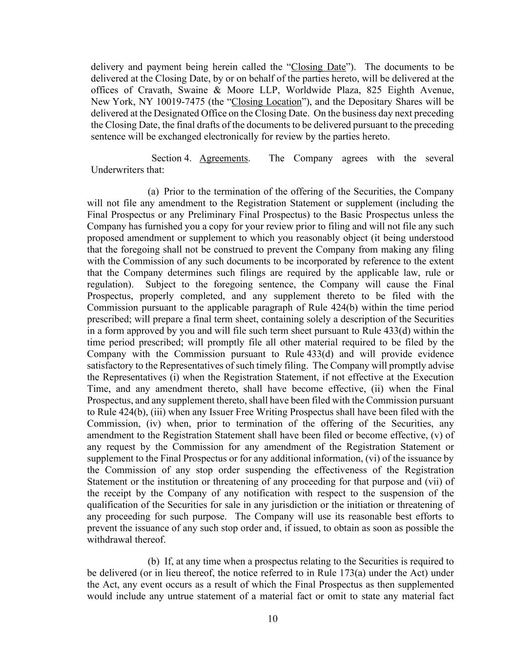 10 delivery and payment being herein called the “Closing Date”). The documents to be delivered at the Closing Date, by or on behalf of the parties hereto, will be delivered at the offices of Cravath, Swaine & Moore LLP, Worldwide Plaza, 825 Eighth Avenue, New York, NY 10019-7475 (the “Closing Location”), and the Depositary Shares will be delivered at the Designated Office on the Closing Date. On the business day next preceding the Closing Date, the final drafts of the documents to be delivered pursuant to the preceding sentence will be exchanged electronically for review by the parties hereto. Section 4. Agreements. The Company agrees with the several Underwriters that: (a) Prior to the termination of the offering of the Securities, the Company will not file any amendment to the Registration Statement or supplement (including the Final Prospectus or any Preliminary Final Prospectus) to the Basic Prospectus unless the Company has furnished you a copy for your review prior to filing and will not file any such proposed amendment or supplement to which you reasonably object (it being understood that the foregoing shall not be construed to prevent the Company from making any filing with the Commission of any such documents to be incorporated by reference to the extent that the Company determines such filings are required by the applicable law, rule or regulation). Subject to the foregoing sentence, the Company will cause the Final Prospectus, properly completed, and any supplement thereto to be filed with the Commission pursuant to the applicable paragraph of Rule 424(b) within the time period prescribed; will prepare a final term sheet, containing solely a description of the Securities in a form approved by you and will file such term sheet pursuant to Rule 433(d) within the time period prescribed; will promptly file all other material required to be filed by the Company with the Commission pursuant to Rule 433(d) and will provide evidence satisfactory to the Representatives of such timely filing. The Company will promptly advise the Representatives (i) when the Registration Statement, if not effective at the Execution Time, and any amendment thereto, shall have become effective, (ii) when the Final Prospectus, and any supplement thereto, shall have been filed with the Commission pursuant to Rule 424(b), (iii) when any Issuer Free Writing Prospectus shall have been filed with the Commission, (iv) when, prior to termination of the offering of the Securities, any amendment to the Registration Statement shall have been filed or become effective, (v) of any request by the Commission for any amendment of the Registration Statement or supplement to the Final Prospectus or for any additional information, (vi) of the issuance by the Commission of any stop order suspending the effectiveness of the Registration Statement or the institution or threatening of any proceeding for that purpose and (vii) of the receipt by the Company of any notification with respect to the suspension of the qualification of the Securities for sale in any jurisdiction or the initiation or threatening of any proceeding for such purpose. The Company will use its reasonable best efforts to prevent the issuance of any such stop order and, if issued, to obtain as soon as possible the withdrawal thereof. (b) If, at any time when a prospectus relating to the Securities is required to be delivered (or in lieu thereof, the notice referred to in Rule 173(a) under the Act) under the Act, any event occurs as a result of which the Final Prospectus as then supplemented would include any untrue statement of a material fact or omit to state any material fact