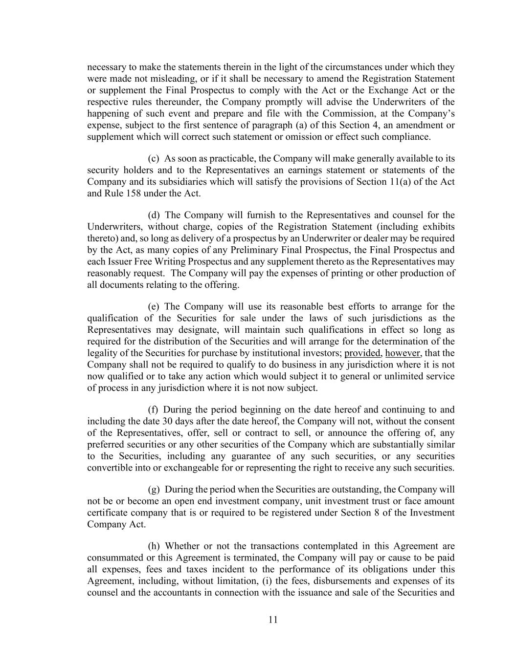 11 necessary to make the statements therein in the light of the circumstances under which they were made not misleading, or if it shall be necessary to amend the Registration Statement or supplement the Final Prospectus to comply with the Act or the Exchange Act or the respective rules thereunder, the Company promptly will advise the Underwriters of the happening of such event and prepare and file with the Commission, at the Company’s expense, subject to the first sentence of paragraph (a) of this Section 4, an amendment or supplement which will correct such statement or omission or effect such compliance. (c) As soon as practicable, the Company will make generally available to its security holders and to the Representatives an earnings statement or statements of the Company and its subsidiaries which will satisfy the provisions of Section 11(a) of the Act and Rule 158 under the Act. (d) The Company will furnish to the Representatives and counsel for the Underwriters, without charge, copies of the Registration Statement (including exhibits thereto) and, so long as delivery of a prospectus by an Underwriter or dealer may be required by the Act, as many copies of any Preliminary Final Prospectus, the Final Prospectus and each Issuer Free Writing Prospectus and any supplement thereto as the Representatives may reasonably request. The Company will pay the expenses of printing or other production of all documents relating to the offering. (e) The Company will use its reasonable best efforts to arrange for the qualification of the Securities for sale under the laws of such jurisdictions as the Representatives may designate, will maintain such qualifications in effect so long as required for the distribution of the Securities and will arrange for the determination of the legality of the Securities for purchase by institutional investors; provided, however, that the Company shall not be required to qualify to do business in any jurisdiction where it is not now qualified or to take any action which would subject it to general or unlimited service of process in any jurisdiction where it is not now subject. (f) During the period beginning on the date hereof and continuing to and including the date 30 days after the date hereof, the Company will not, without the consent of the Representatives, offer, sell or contract to sell, or announce the offering of, any preferred securities or any other securities of the Company which are substantially similar to the Securities, including any guarantee of any such securities, or any securities convertible into or exchangeable for or representing the right to receive any such securities. (g) During the period when the Securities are outstanding, the Company will not be or become an open end investment company, unit investment trust or face amount certificate company that is or required to be registered under Section 8 of the Investment Company Act. (h) Whether or not the transactions contemplated in this Agreement are consummated or this Agreement is terminated, the Company will pay or cause to be paid all expenses, fees and taxes incident to the performance of its obligations under this Agreement, including, without limitation, (i) the fees, disbursements and expenses of its counsel and the accountants in connection with the issuance and sale of the Securities and