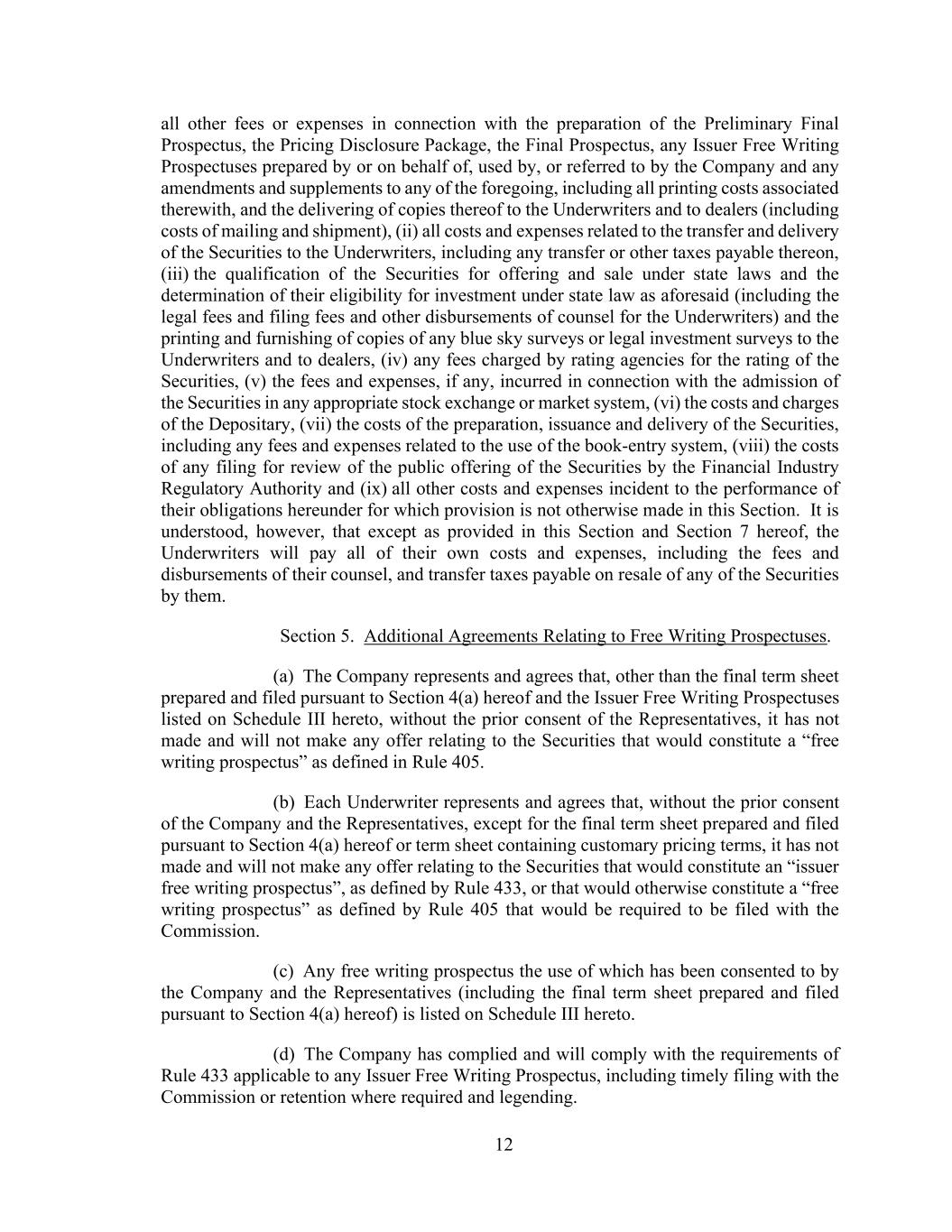 12 all other fees or expenses in connection with the preparation of the Preliminary Final Prospectus, the Pricing Disclosure Package, the Final Prospectus, any Issuer Free Writing Prospectuses prepared by or on behalf of, used by, or referred to by the Company and any amendments and supplements to any of the foregoing, including all printing costs associated therewith, and the delivering of copies thereof to the Underwriters and to dealers (including costs of mailing and shipment), (ii) all costs and expenses related to the transfer and delivery of the Securities to the Underwriters, including any transfer or other taxes payable thereon, (iii) the qualification of the Securities for offering and sale under state laws and the determination of their eligibility for investment under state law as aforesaid (including the legal fees and filing fees and other disbursements of counsel for the Underwriters) and the printing and furnishing of copies of any blue sky surveys or legal investment surveys to the Underwriters and to dealers, (iv) any fees charged by rating agencies for the rating of the Securities, (v) the fees and expenses, if any, incurred in connection with the admission of the Securities in any appropriate stock exchange or market system, (vi) the costs and charges of the Depositary, (vii) the costs of the preparation, issuance and delivery of the Securities, including any fees and expenses related to the use of the book-entry system, (viii) the costs of any filing for review of the public offering of the Securities by the Financial Industry Regulatory Authority and (ix) all other costs and expenses incident to the performance of their obligations hereunder for which provision is not otherwise made in this Section. It is understood, however, that except as provided in this Section and Section 7 hereof, the Underwriters will pay all of their own costs and expenses, including the fees and disbursements of their counsel, and transfer taxes payable on resale of any of the Securities by them. Section 5. Additional Agreements Relating to Free Writing Prospectuses. (a) The Company represents and agrees that, other than the final term sheet prepared and filed pursuant to Section 4(a) hereof and the Issuer Free Writing Prospectuses listed on Schedule III hereto, without the prior consent of the Representatives, it has not made and will not make any offer relating to the Securities that would constitute a “free writing prospectus” as defined in Rule 405. (b) Each Underwriter represents and agrees that, without the prior consent of the Company and the Representatives, except for the final term sheet prepared and filed pursuant to Section 4(a) hereof or term sheet containing customary pricing terms, it has not made and will not make any offer relating to the Securities that would constitute an “issuer free writing prospectus”, as defined by Rule 433, or that would otherwise constitute a “free writing prospectus” as defined by Rule 405 that would be required to be filed with the Commission. (c) Any free writing prospectus the use of which has been consented to by the Company and the Representatives (including the final term sheet prepared and filed pursuant to Section 4(a) hereof) is listed on Schedule III hereto. (d) The Company has complied and will comply with the requirements of Rule 433 applicable to any Issuer Free Writing Prospectus, including timely filing with the Commission or retention where required and legending.